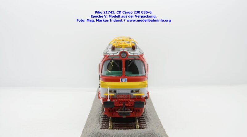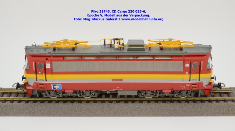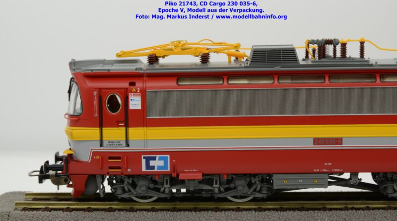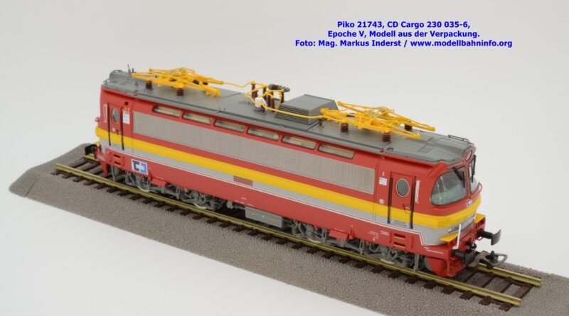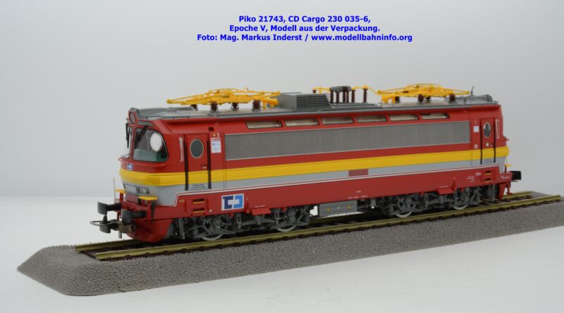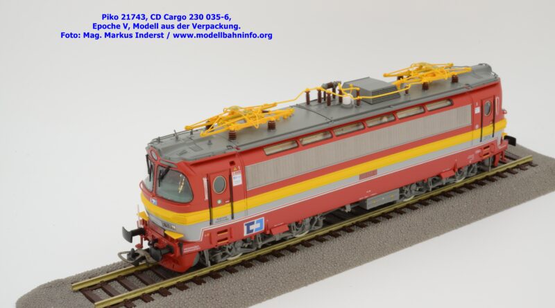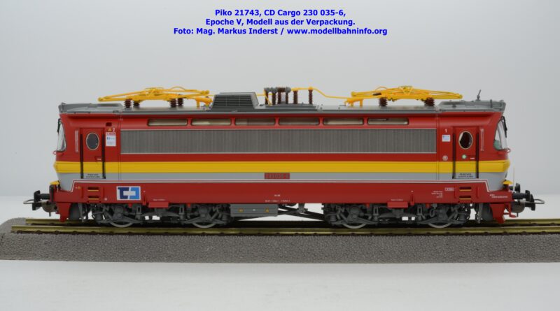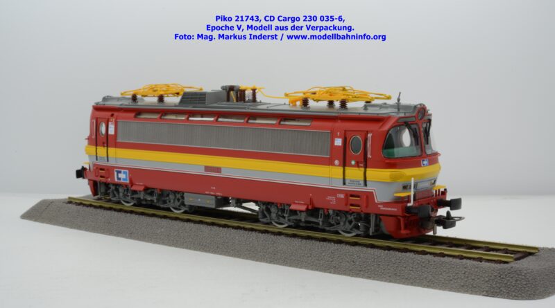 Mit diesem Modell erscheint ein Modell einer Laminatka in der Ursprungslackierung, welche aber durch die zusätzlichen Piktogramme von CD Cargo in die Ära der Epoche V fällt. Piko hat sich die 230 035-6 von CD Cargo zum Vorbild genommen, welche am Rahmen als auch neben den Führerstandstüren entsprechende Aufkleber zu den geänderten Eigentumsverhältnissen verfügt. Die Lok ist ebenfalls dem Depot Ceské Budéjovice beheimatet. Am Modell sind keine Untersuchungsfristen angeschrieben. Piko hat diese Modellausführung mit drei unterschiedlichen Ausführungen bedacht, indem unter der Artikelnummer 21743 die analoge Gleichstrom-Ausführung zum UVP von € 269,– bzw. unter der Artikelnummer 21744 die digitale Gleichstrom-Ausführung zum erhöhten UVP von € 379,– erhältlich ist. Für das Dreileiter-Wechselstrom-System liegt die mit Decoder ausgestattete Variante unter der Artikelnummer 21745 zur Verfügung.