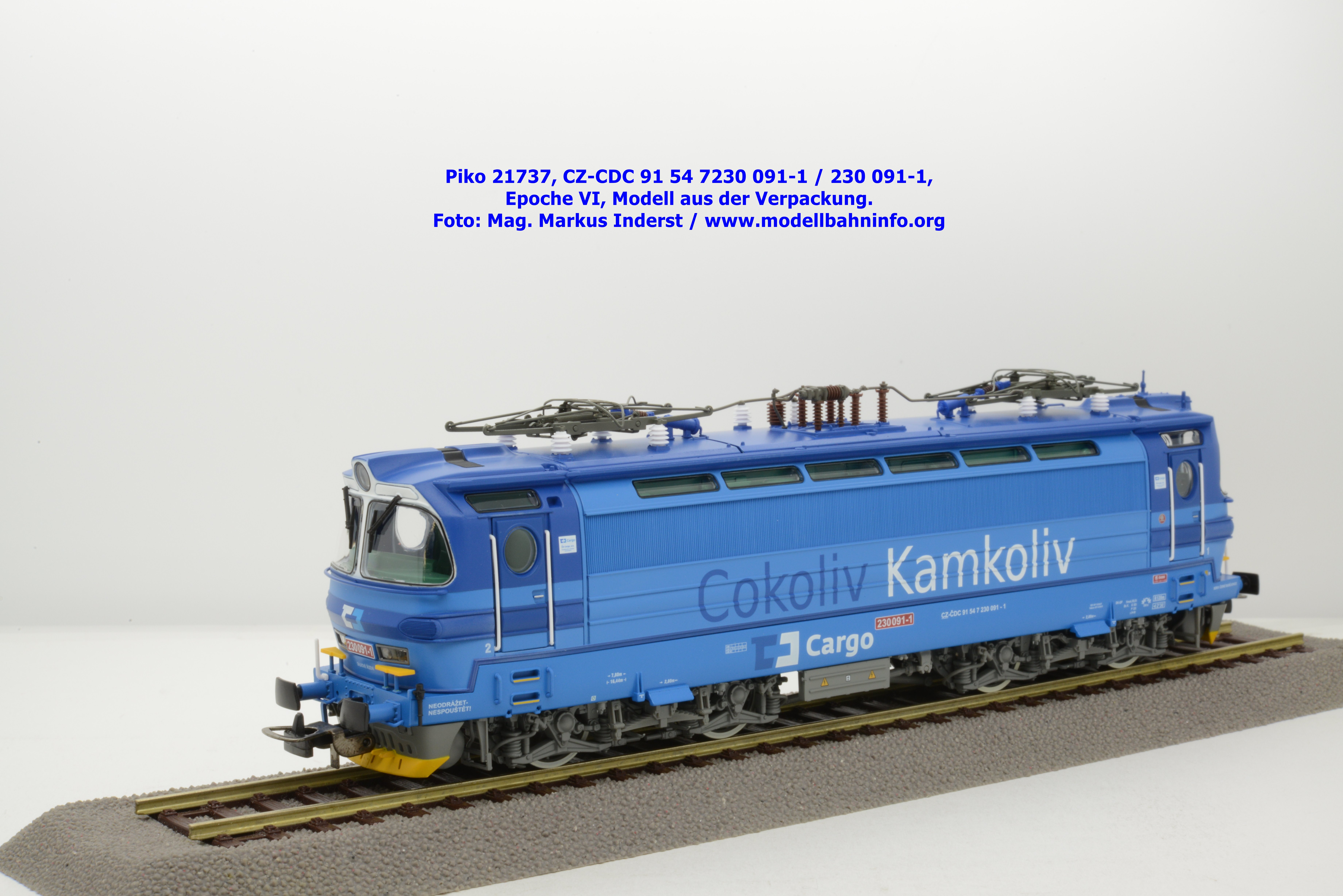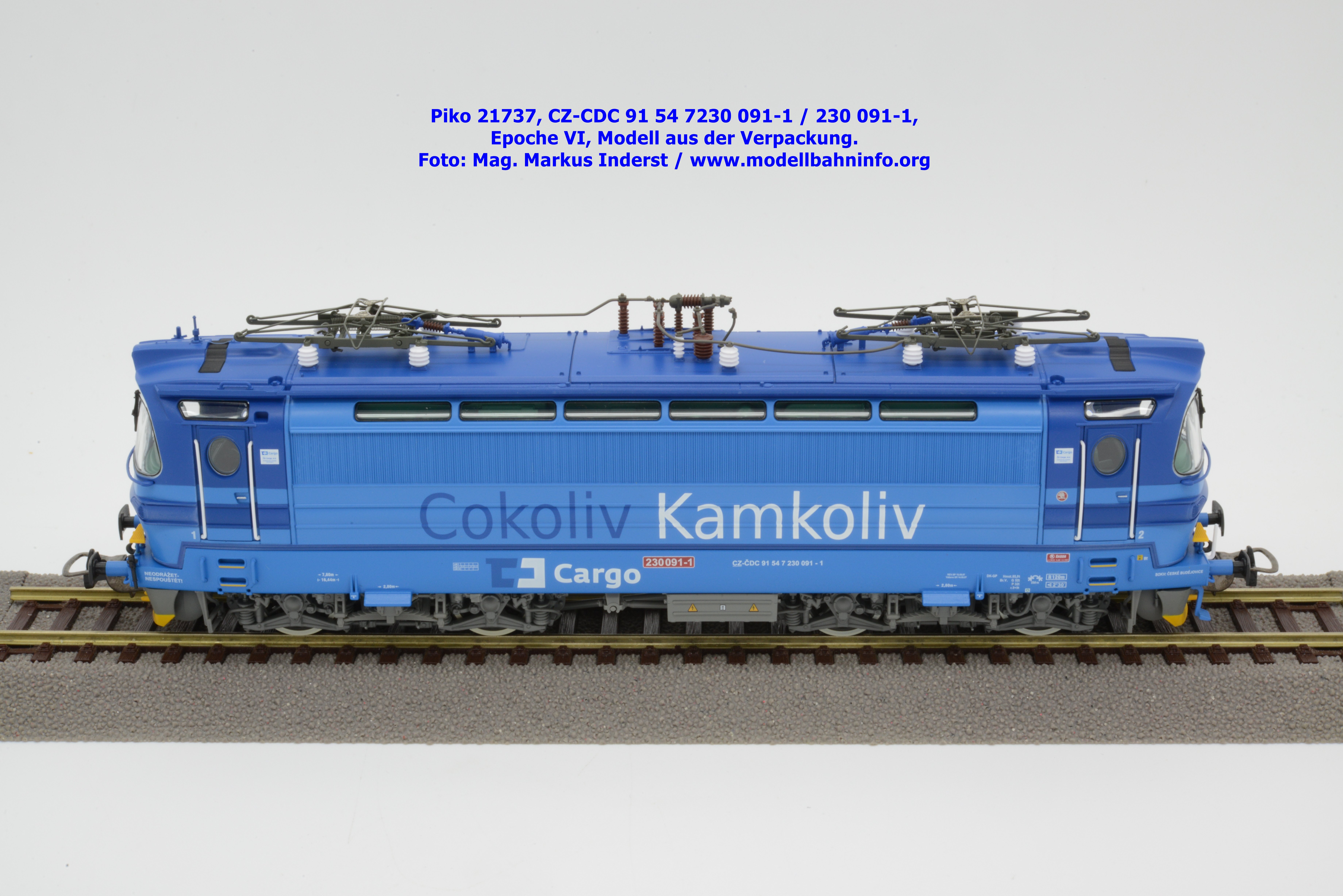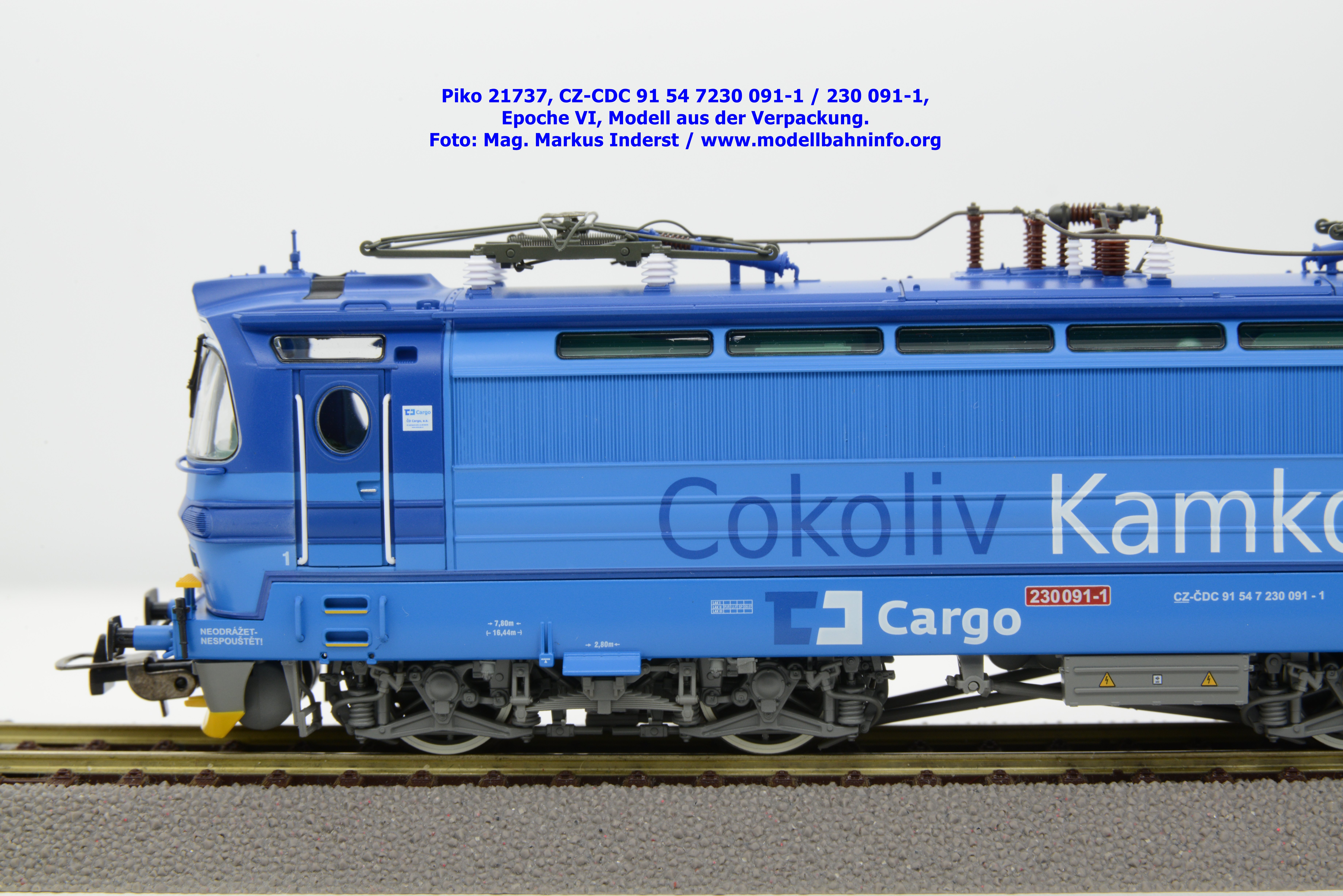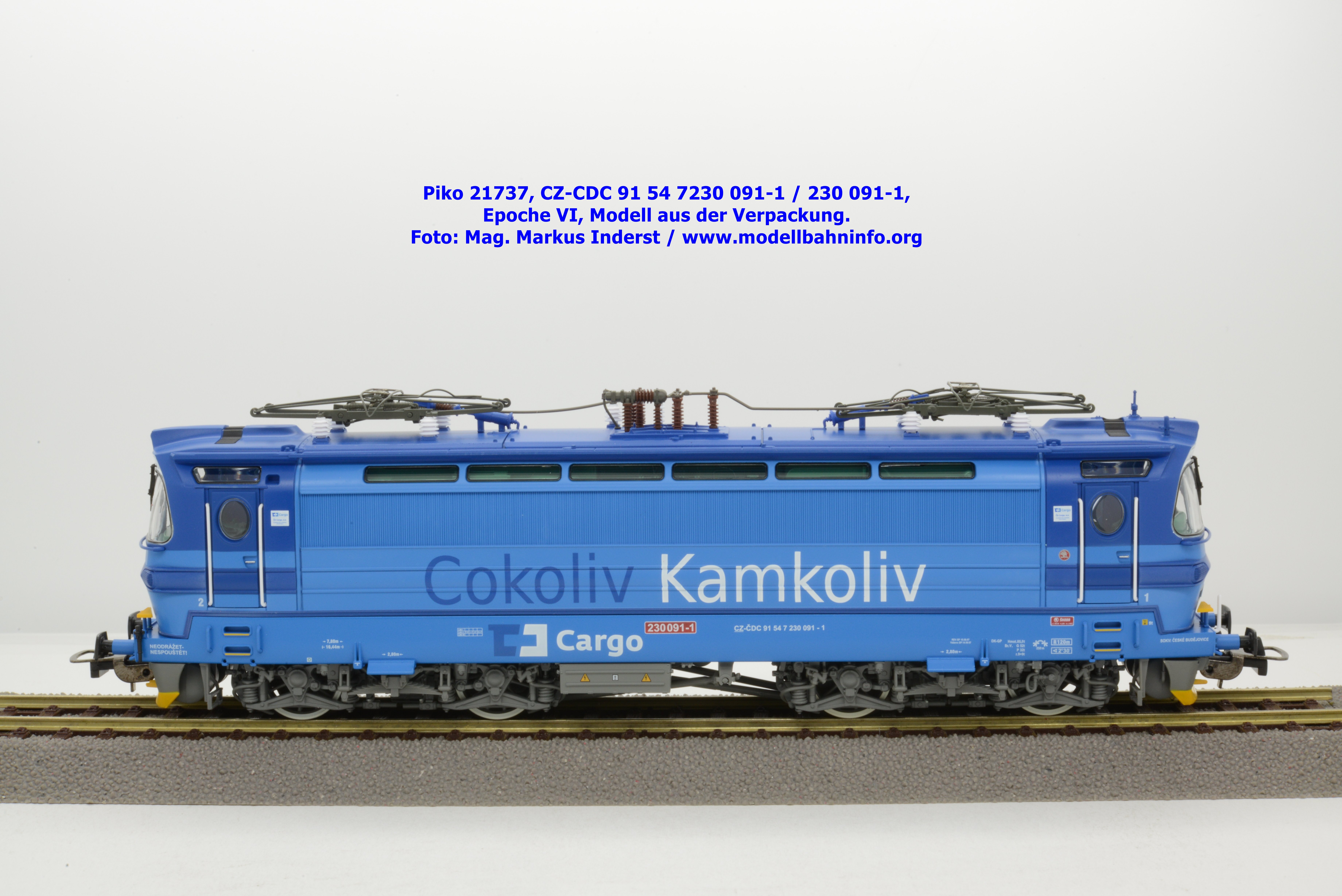 Die Herbstneuheiten bringen zwei weitere Varianten der Laminatka auf den Markt, wobei dieses Modell schon zuvor in der Baugröße TT zuerst erschienen ist. Mit diesem Modell erscheint eine weitere Vertreterin der Laminatka in blauer Farbgebung von CD Cargo, wobei sich das gegenständliche Modell von der vorigen Variante optisch schon unterscheidet. Die Firmenanschrift CD Cargo ist auf den Fahrzeugrahmen gewandert, am Lokkasten ist nun der Schriftzug „Cokoliv Kamkoliv“ in dunkelblauer/weißer Farbe zu lesen. Was damit zum Ausdruck gebracht werden will, ist unbekannt. Die Lok befindet sich im Erscheinungsbild der Epoche VI. Sie ist weiterhin mit der alten CD-Nummer 230 091-1 und der NVR-Nummer CZ-CDC 91 54 7230 091-1 bedruckt. Sie ist beim Depot Ceské Budéjovice beheimatet. Die letzten Untersuchungsdaten werden mit REV SP 15.09.07 bzw. Vázano SP 14.09.07 angegeben. Das Modell ist in drei Ausführungen erhältlich. Unter der oben angeführten Artikelnummer ist zum UVP von € 269,– die analoge Zweileiter-Gleichstromausführung verfügbar. Die digitale Ausführung für das Zweileiter-Gleichstromsystem weist die Artikelnummer 21738 und den UVP von € 379,– auf. Das Dreileiter-Wechselstrom-Modell wird unter der Artikelnummer 21739 geführt.
