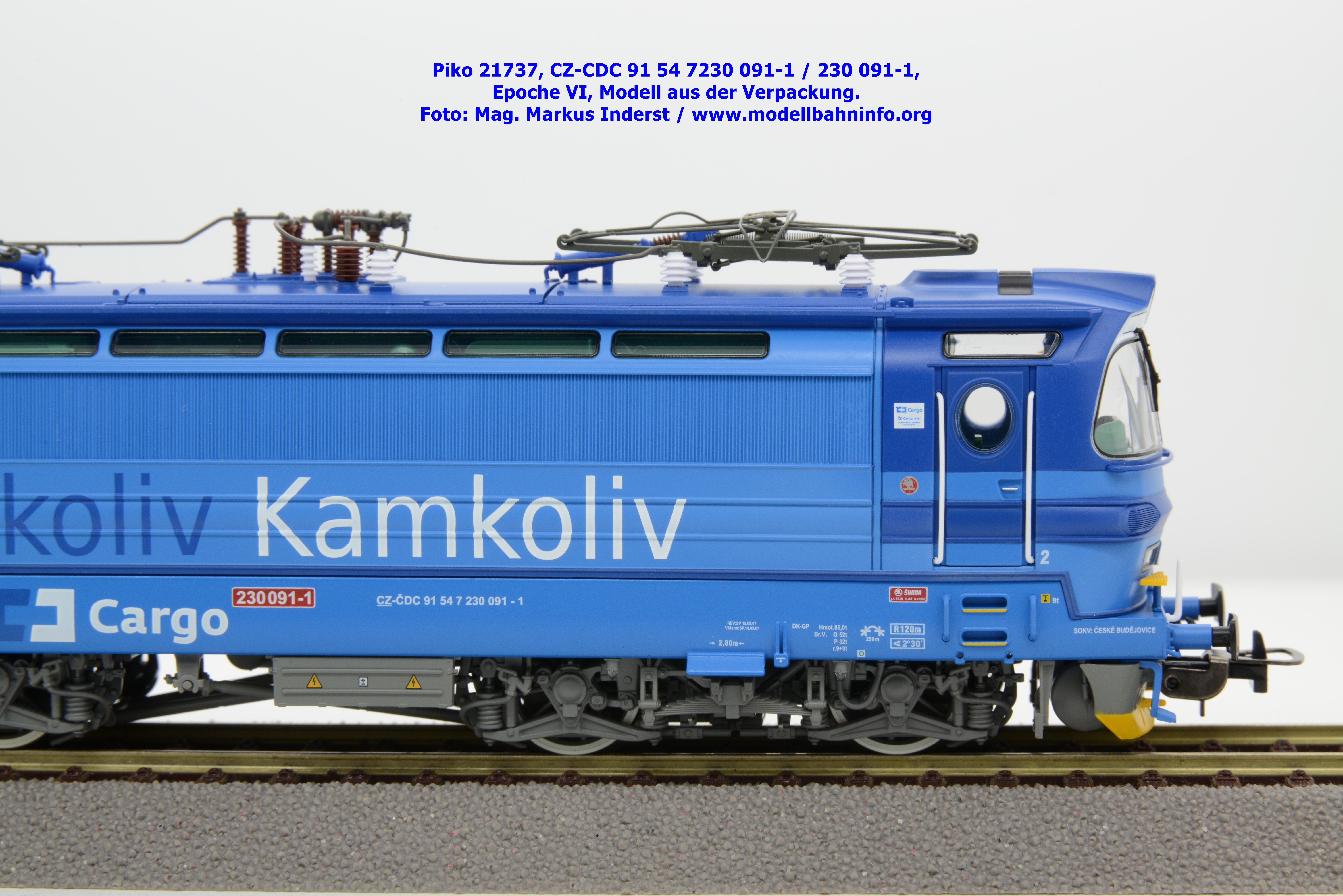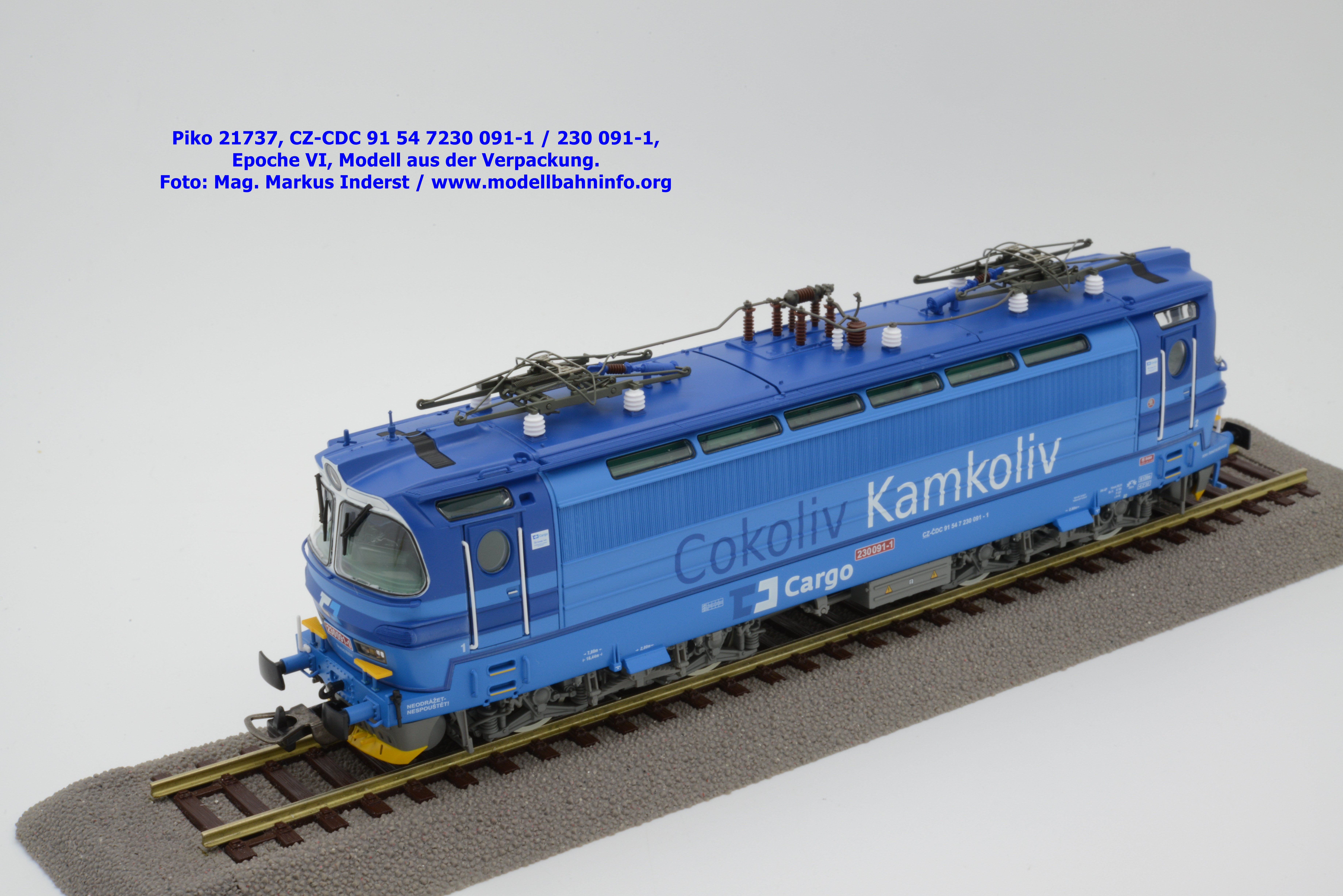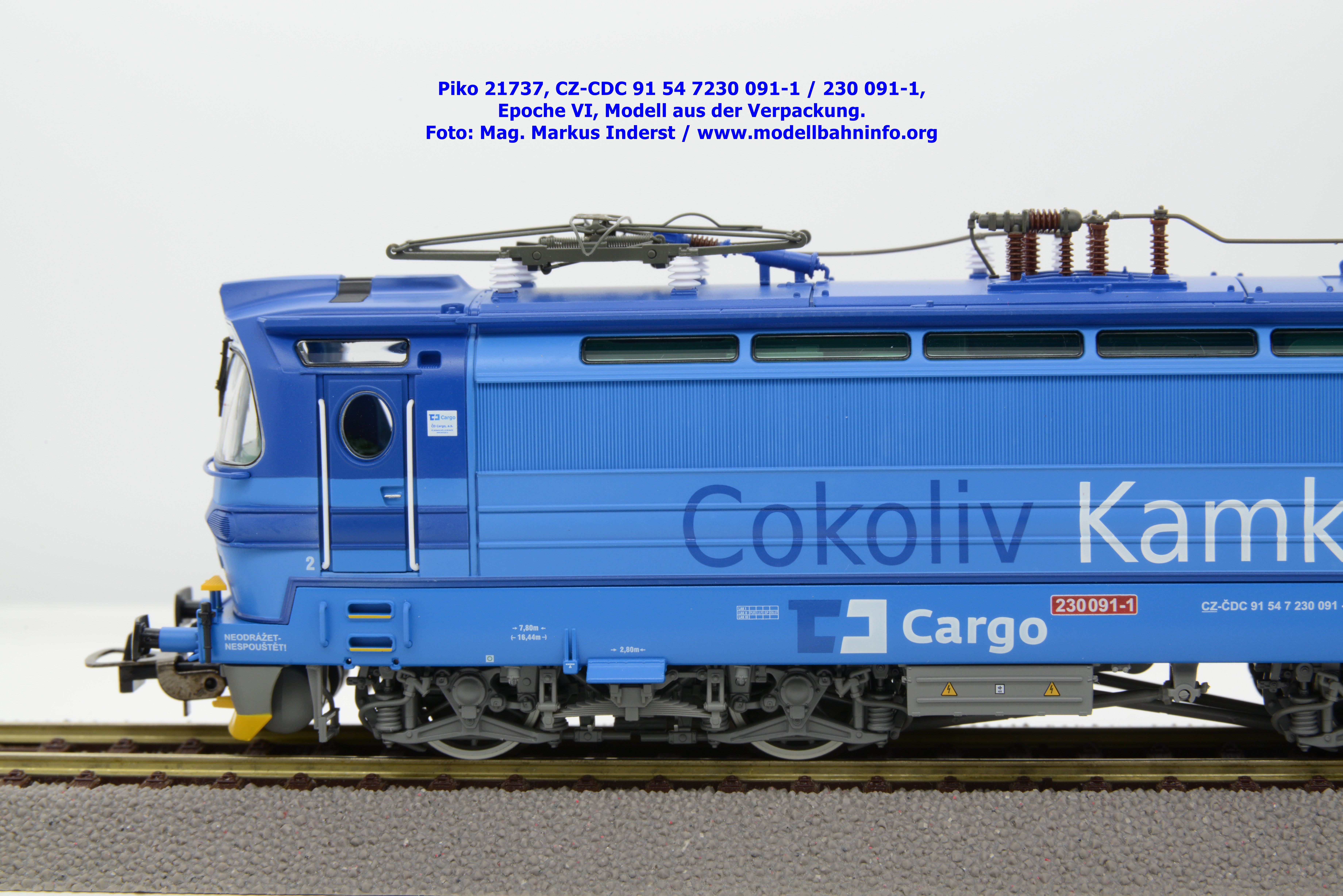 Die Herbstneuheiten bringen zwei weitere Varianten der Laminatka auf den Markt, wobei dieses Modell schon zuvor in der Baugröße TT zuerst erschienen ist. Mit diesem Modell erscheint eine weitere Vertreterin der Laminatka in blauer Farbgebung von CD Cargo, wobei sich das gegenständliche Modell von der vorigen Variante optisch schon unterscheidet. Die Firmenanschrift CD Cargo ist auf den Fahrzeugrahmen gewandert, am Lokkasten ist nun der Schriftzug „Cokoliv Kamkoliv“ in dunkelblauer/weißer Farbe zu lesen. Was damit zum Ausdruck gebracht werden will, ist unbekannt. Die Lok befindet sich im Erscheinungsbild der Epoche VI. Sie ist weiterhin mit der alten CD-Nummer 230 091-1 und der NVR-Nummer CZ-CDC 91 54 7230 091-1 bedruckt. Sie ist beim Depot Ceské Budéjovice beheimatet. Die letzten Untersuchungsdaten werden mit REV SP 15.09.07 bzw. Vázano SP 14.09.07 angegeben. Das Modell ist in drei Ausführungen erhältlich. Unter der oben angeführten Artikelnummer ist zum UVP von € 269,– die analoge Zweileiter-Gleichstromausführung verfügbar. Die digitale Ausführung für das Zweileiter-Gleichstromsystem weist die Artikelnummer 21738 und den UVP von € 379,– auf. Das Dreileiter-Wechselstrom-Modell wird unter der Artikelnummer 21739 geführt.