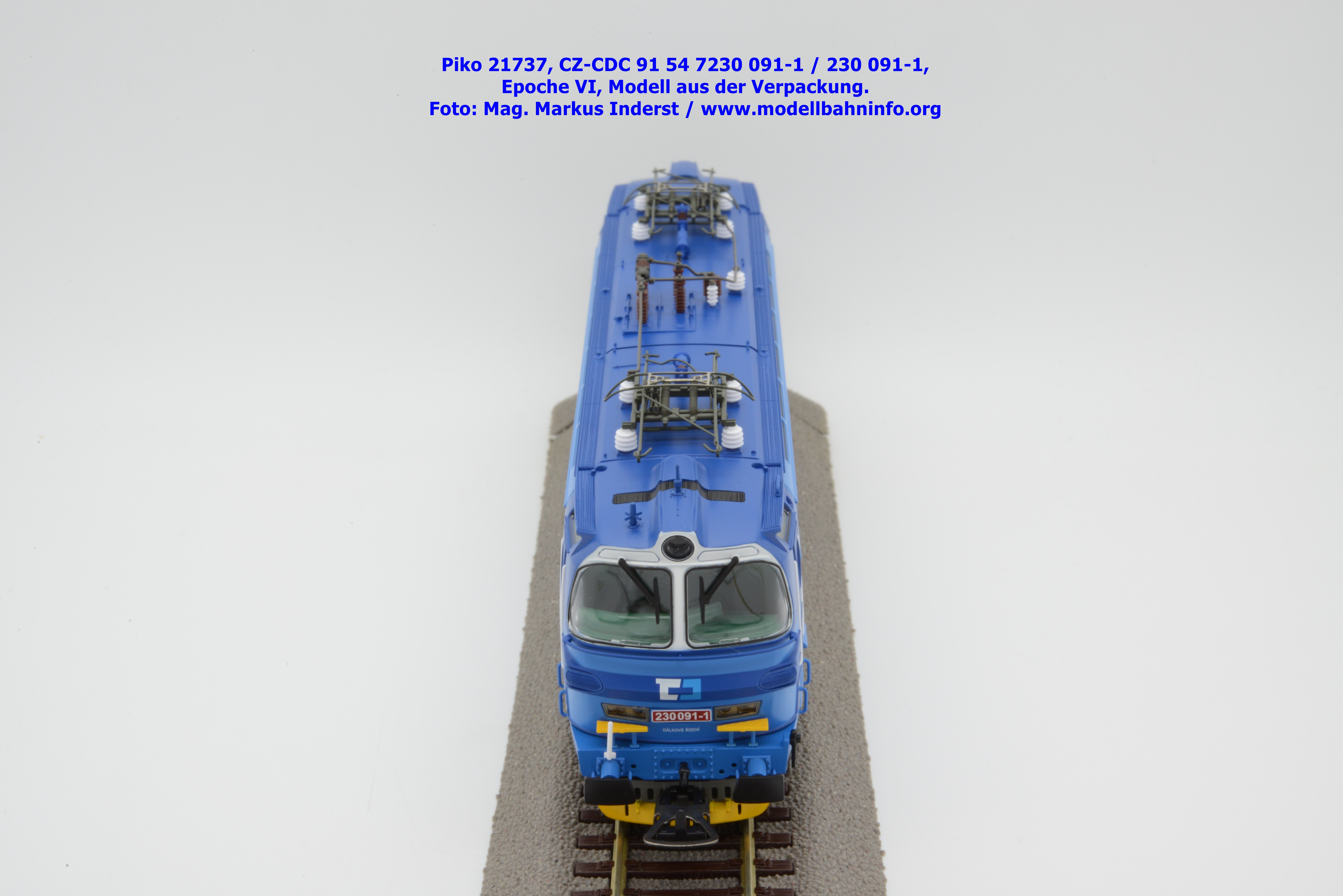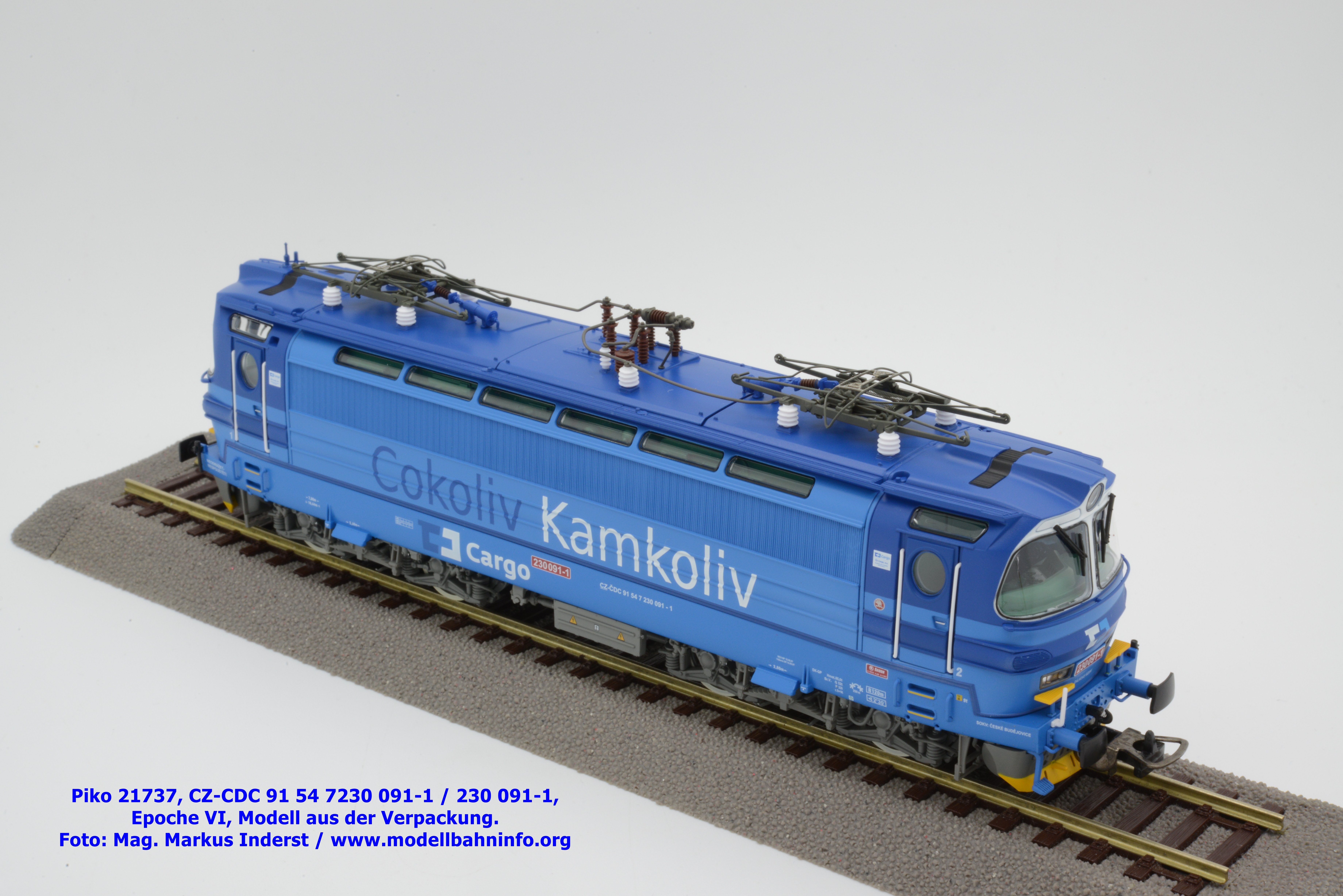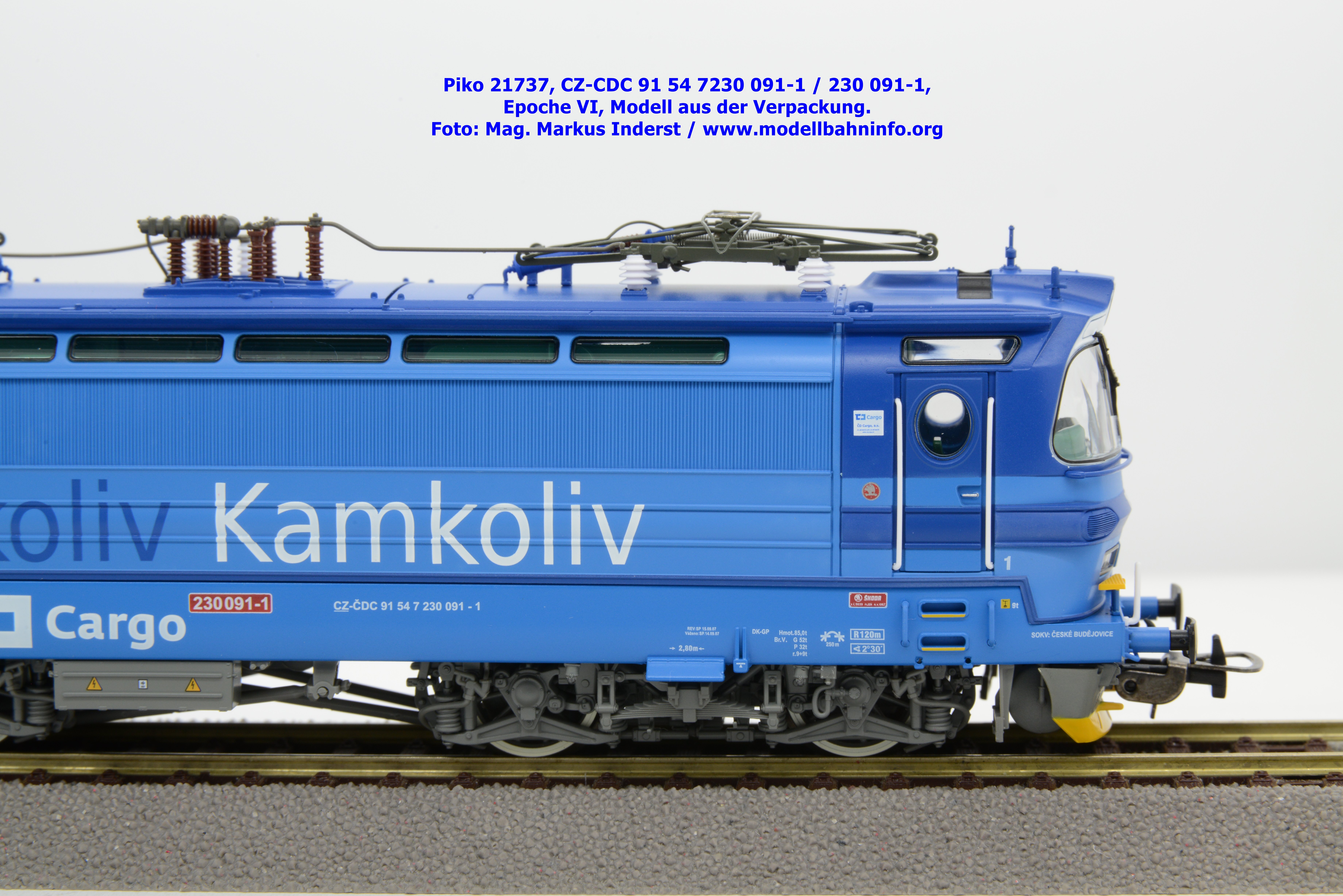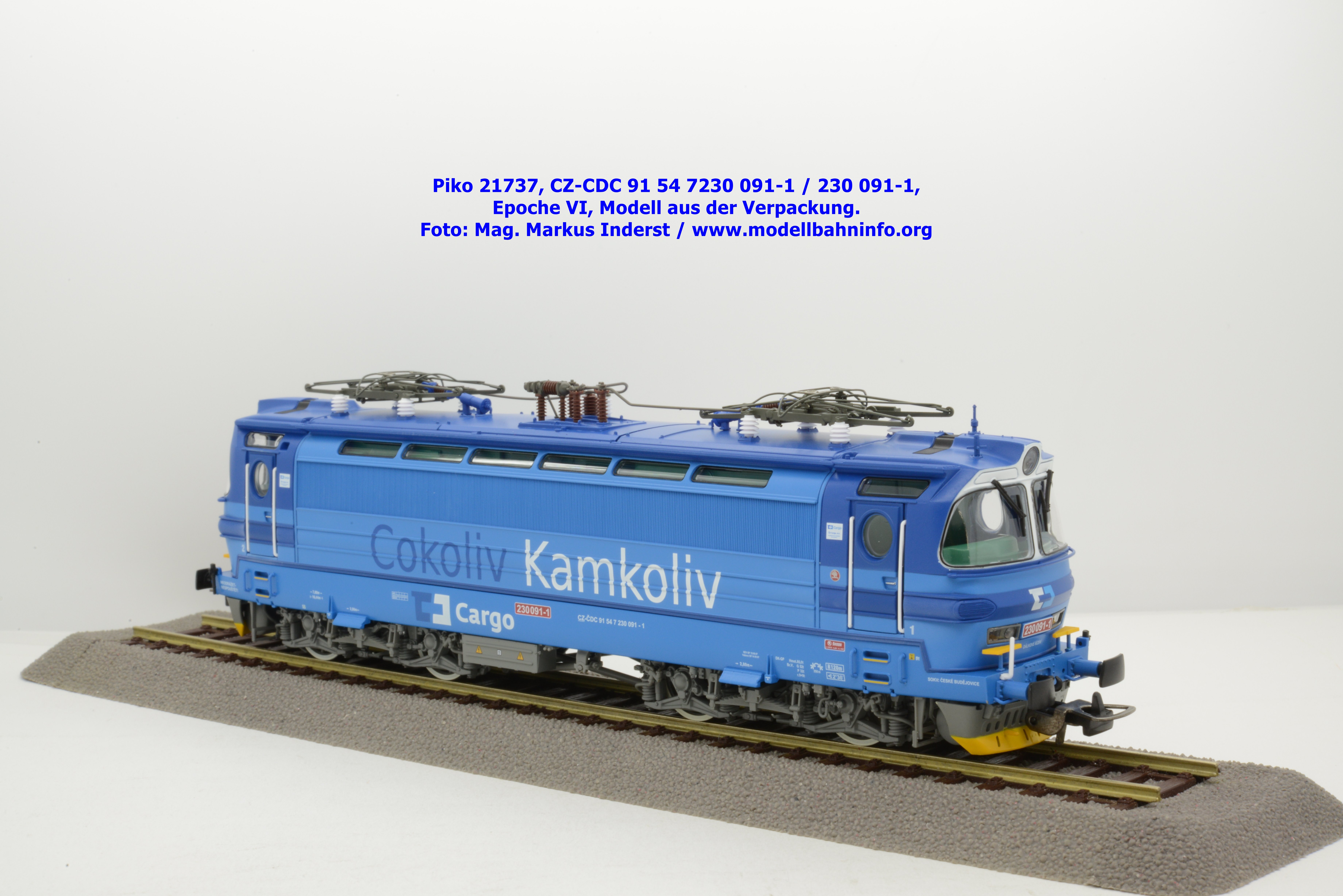 Die Herbstneuheiten bringen zwei weitere Varianten der Laminatka auf den Markt, wobei dieses Modell schon zuvor in der Baugröße TT zuerst erschienen ist. Mit diesem Modell erscheint eine weitere Vertreterin der Laminatka in blauer Farbgebung von CD Cargo, wobei sich das gegenständliche Modell von der vorigen Variante optisch schon unterscheidet. Die Firmenanschrift CD Cargo ist auf den Fahrzeugrahmen gewandert, am Lokkasten ist nun der Schriftzug „Cokoliv Kamkoliv“ in dunkelblauer/weißer Farbe zu lesen. Was damit zum Ausdruck gebracht werden will, ist unbekannt. Die Lok befindet sich im Erscheinungsbild der Epoche VI. Sie ist weiterhin mit der alten CD-Nummer 230 091-1 und der NVR-Nummer CZ-CDC 91 54 7230 091-1 bedruckt. Sie ist beim Depot Ceské Budéjovice beheimatet. Die letzten Untersuchungsdaten werden mit REV SP 15.09.07 bzw. Vázano SP 14.09.07 angegeben. Das Modell ist in drei Ausführungen erhältlich. Unter der oben angeführten Artikelnummer ist zum UVP von € 269,– die analoge Zweileiter-Gleichstromausführung verfügbar. Die digitale Ausführung für das Zweileiter-Gleichstromsystem weist die Artikelnummer 21738 und den UVP von € 379,– auf. Das Dreileiter-Wechselstrom-Modell wird unter der Artikelnummer 21739 geführt.