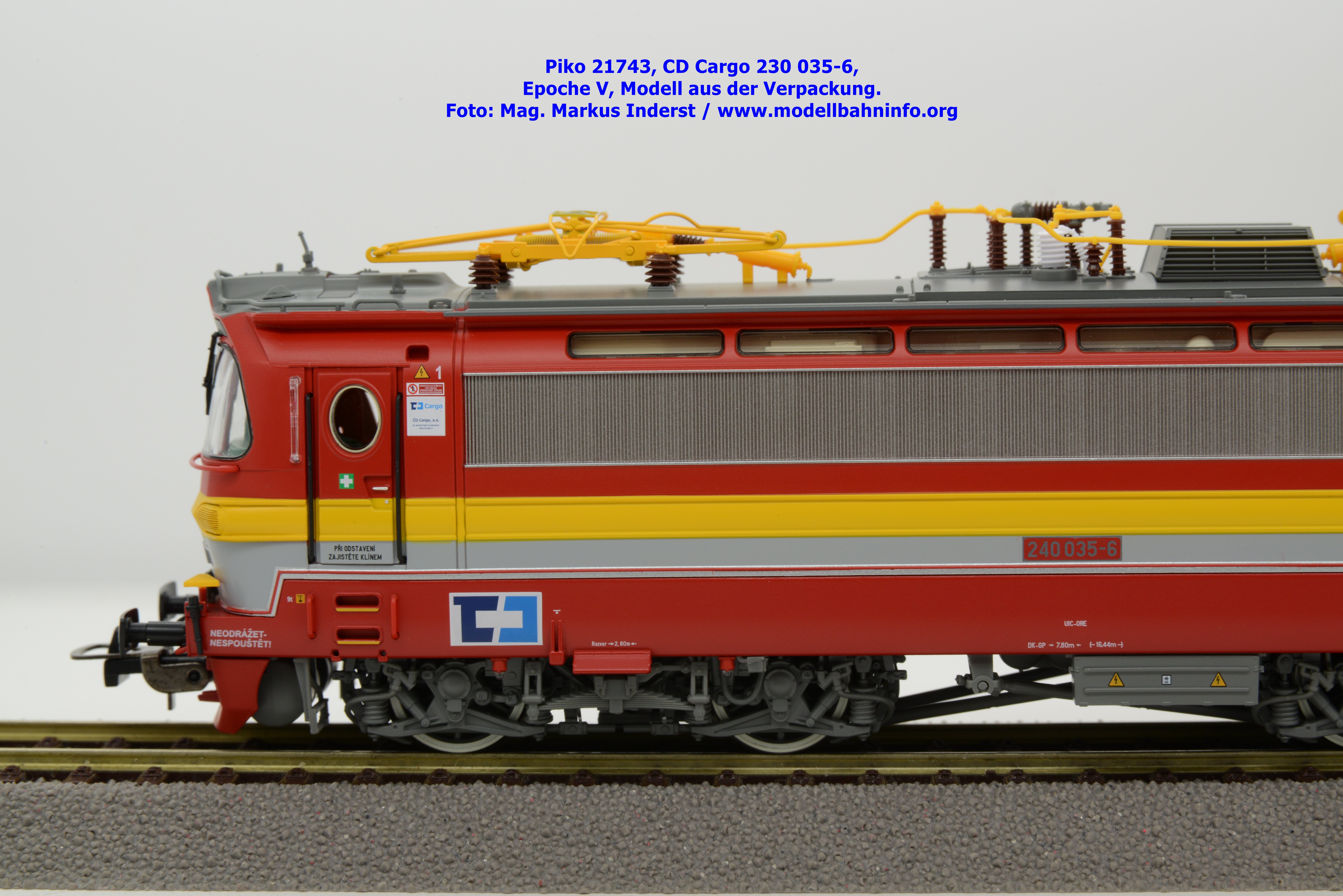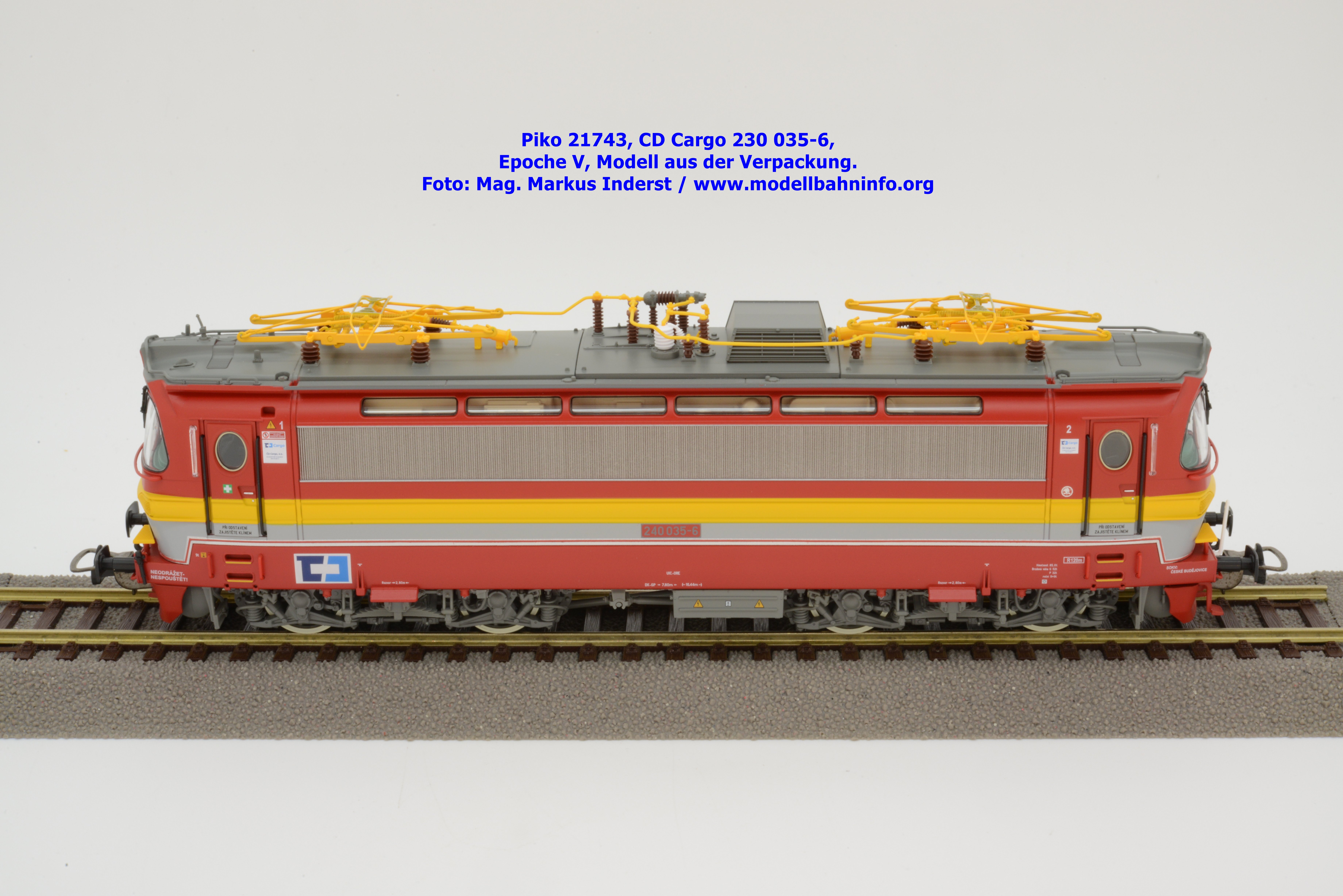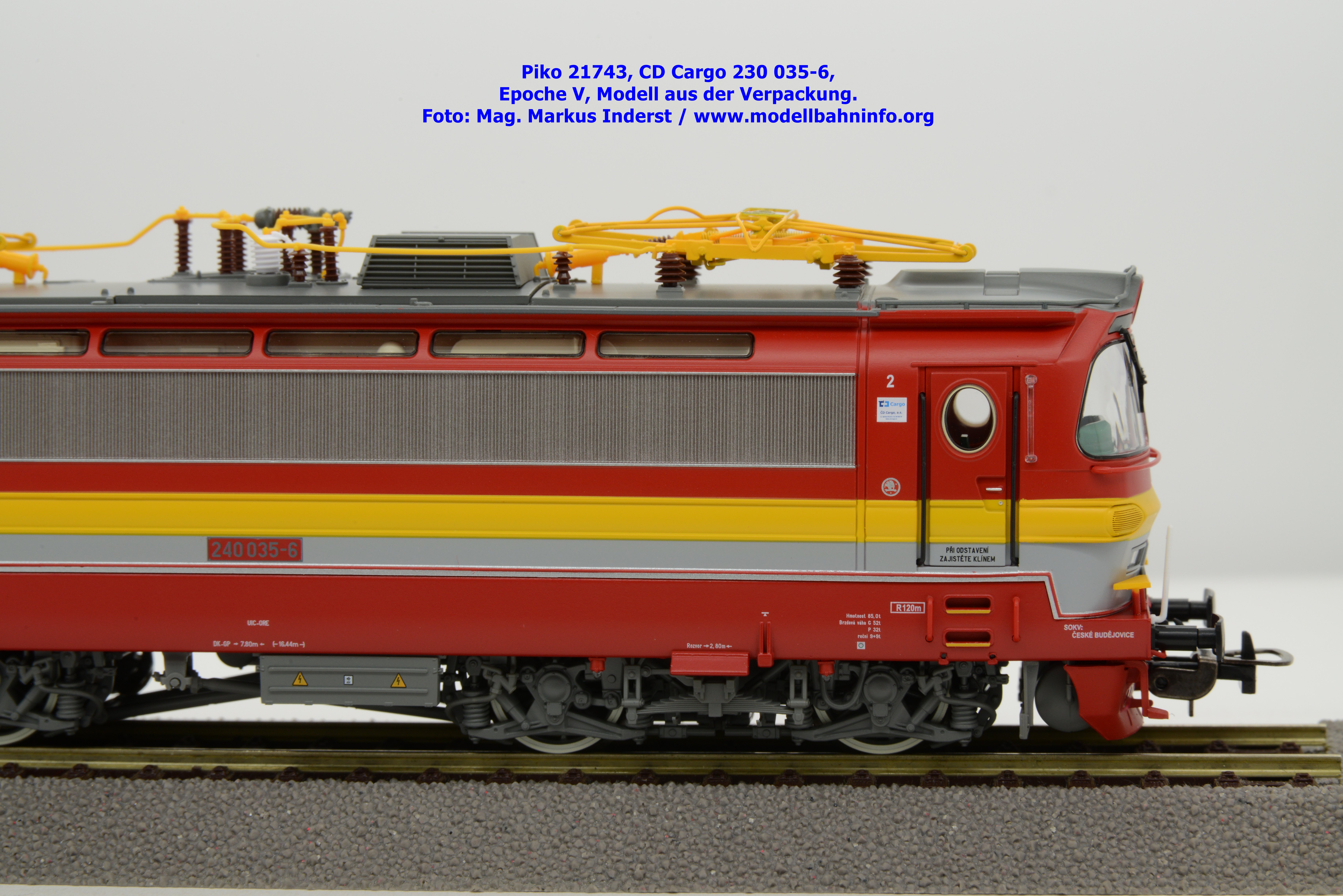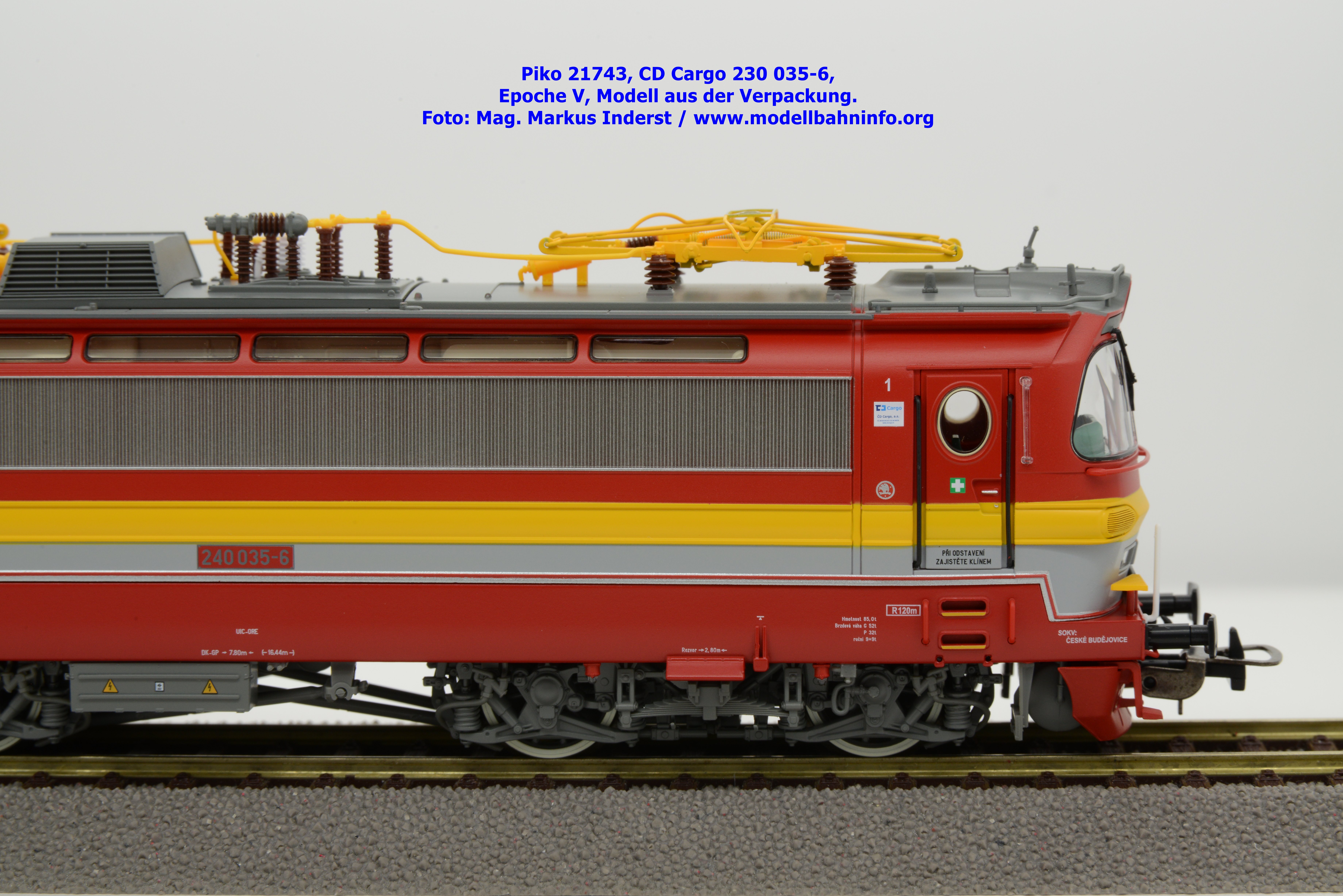 Mit diesem Modell erscheint ein Modell einer Laminatka in der Ursprungslackierung, welche aber durch die zusätzlichen Piktogramme von CD Cargo in die Ära der Epoche V fällt. Piko hat sich die 230 035-6 von CD Cargo zum Vorbild genommen, welche am Rahmen als auch neben den Führerstandstüren entsprechende Aufkleber zu den geänderten Eigentumsverhältnissen verfügt. Die Lok ist ebenfalls dem Depot Ceské Budéjovice beheimatet. Am Modell sind keine Untersuchungsfristen angeschrieben. Piko hat diese Modellausführung mit drei unterschiedlichen Ausführungen bedacht, indem unter der Artikelnummer 21743 die analoge Gleichstrom-Ausführung zum UVP von € 269,– bzw. unter der Artikelnummer 21744 die digitale Gleichstrom-Ausführung zum erhöhten UVP von € 379,– erhältlich ist. Für das Dreileiter-Wechselstrom-System liegt die mit Decoder ausgestattete Variante unter der Artikelnummer 21745 zur Verfügung.