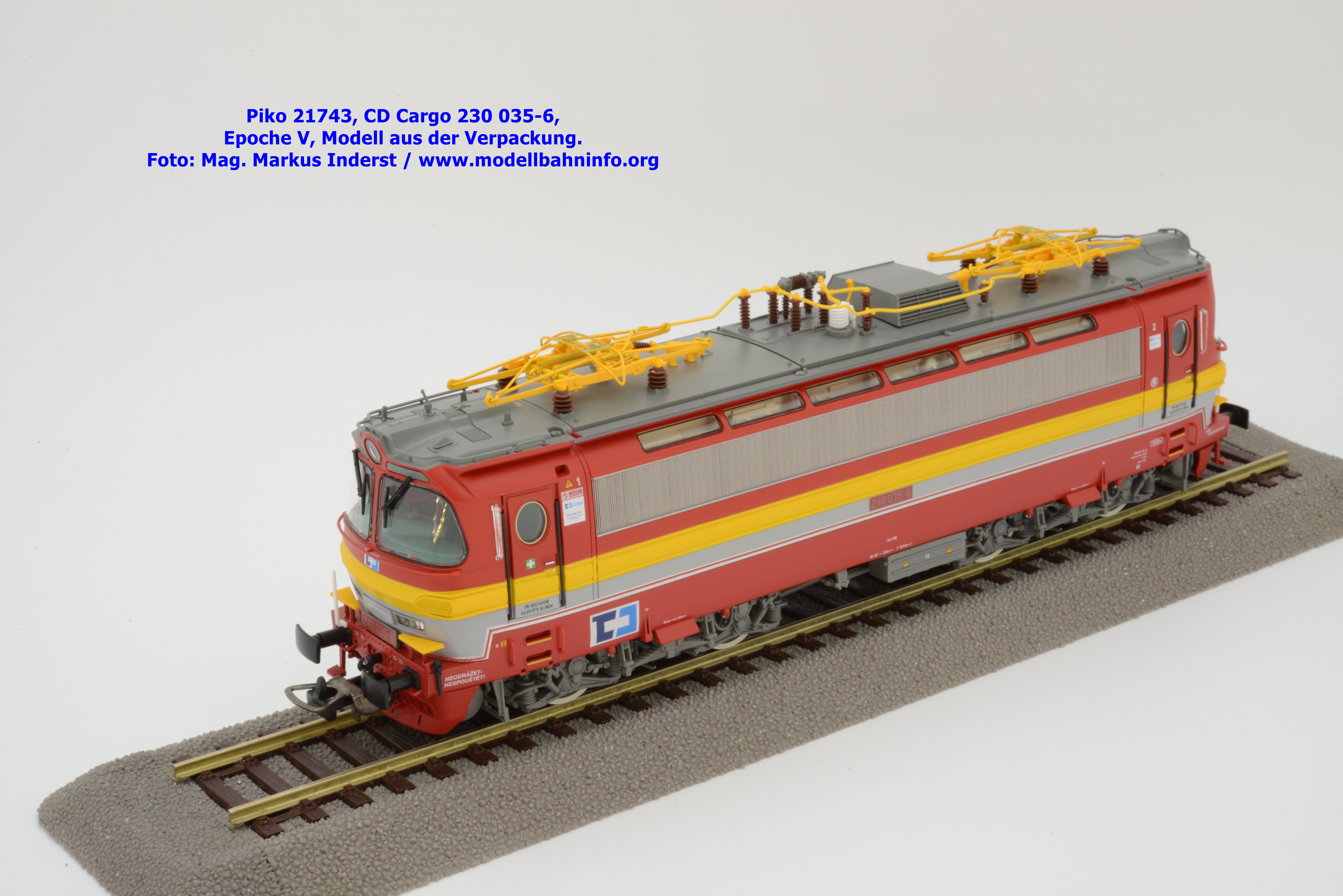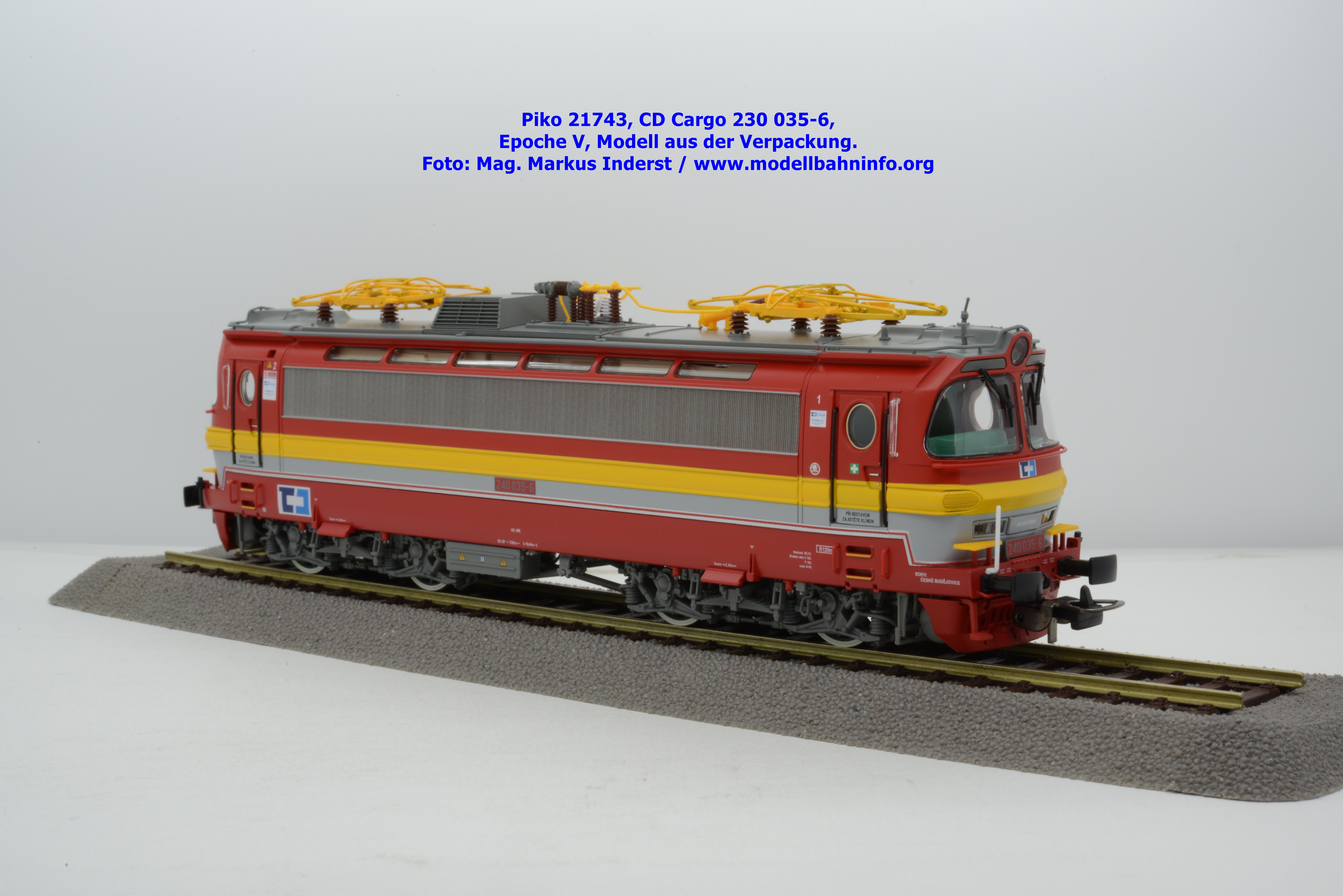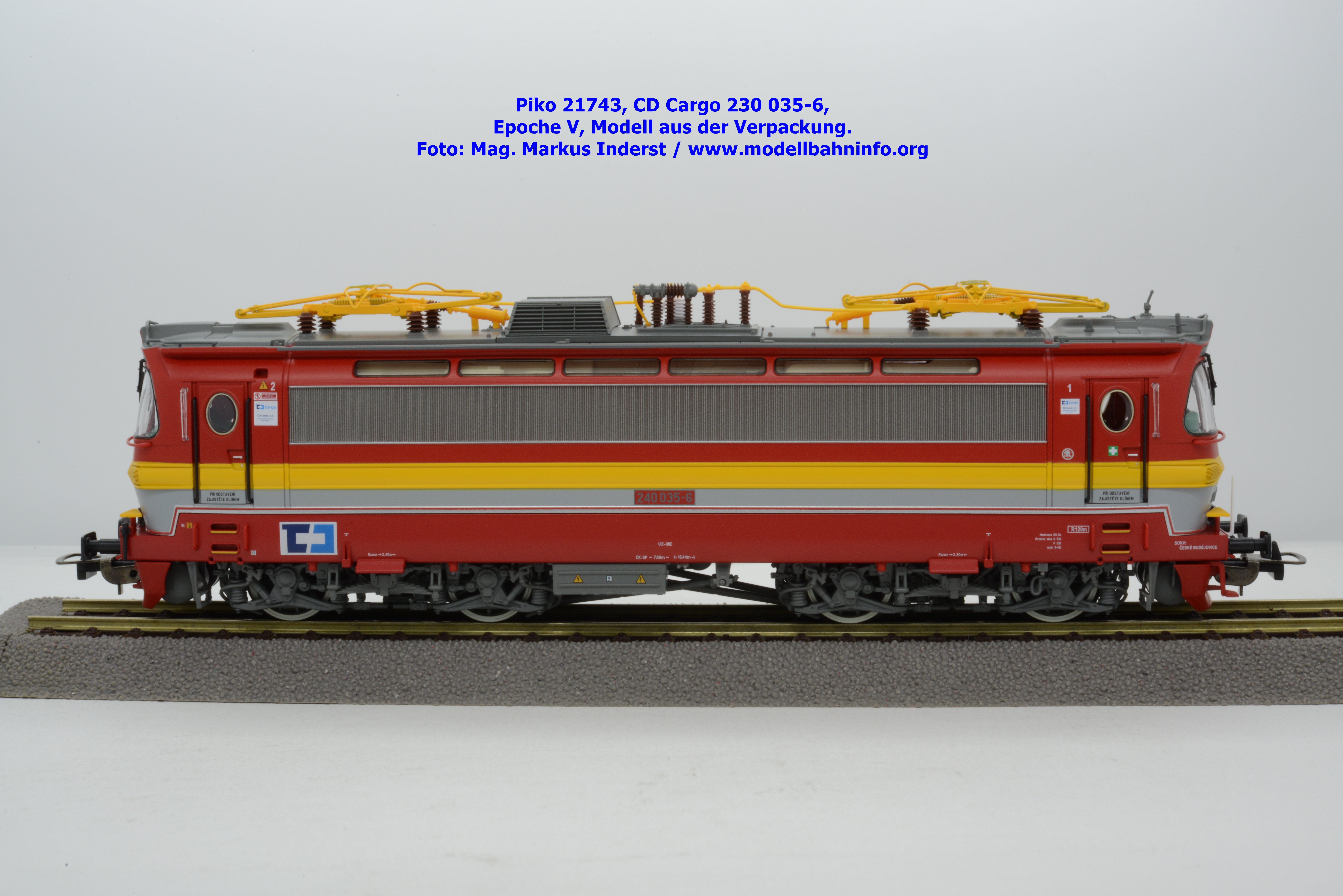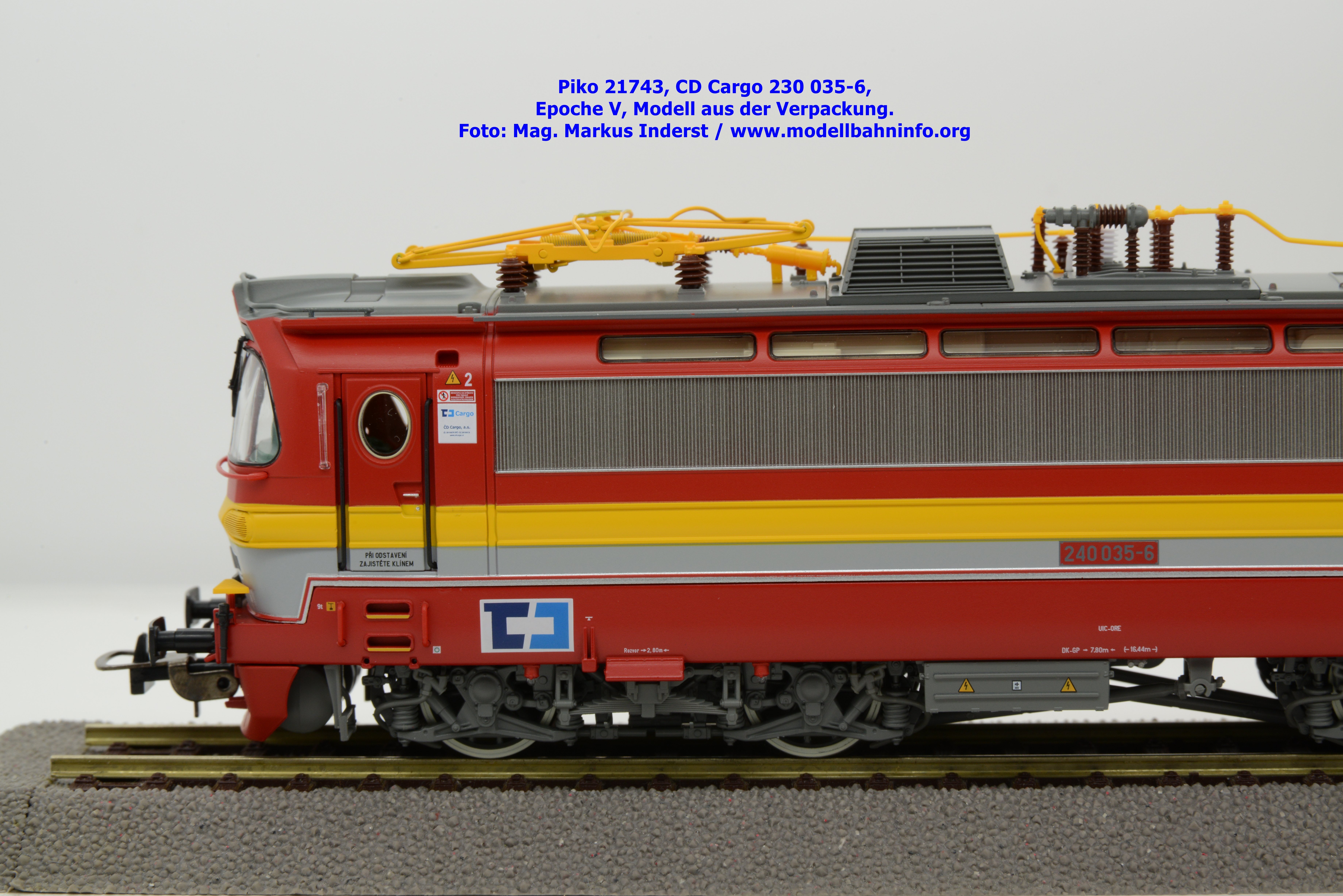 Mit diesem Modell erscheint ein Modell einer Laminatka in der Ursprungslackierung, welche aber durch die zusätzlichen Piktogramme von CD Cargo in die Ära der Epoche V fällt. Piko hat sich die 230 035-6 von CD Cargo zum Vorbild genommen, welche am Rahmen als auch neben den Führerstandstüren entsprechende Aufkleber zu den geänderten Eigentumsverhältnissen verfügt. Die Lok ist ebenfalls dem Depot Ceské Budéjovice beheimatet. Am Modell sind keine Untersuchungsfristen angeschrieben. Piko hat diese Modellausführung mit drei unterschiedlichen Ausführungen bedacht, indem unter der Artikelnummer 21743 die analoge Gleichstrom-Ausführung zum UVP von € 269,– bzw. unter der Artikelnummer 21744 die digitale Gleichstrom-Ausführung zum erhöhten UVP von € 379,– erhältlich ist. Für das Dreileiter-Wechselstrom-System liegt die mit Decoder ausgestattete Variante unter der Artikelnummer 21745 zur Verfügung.