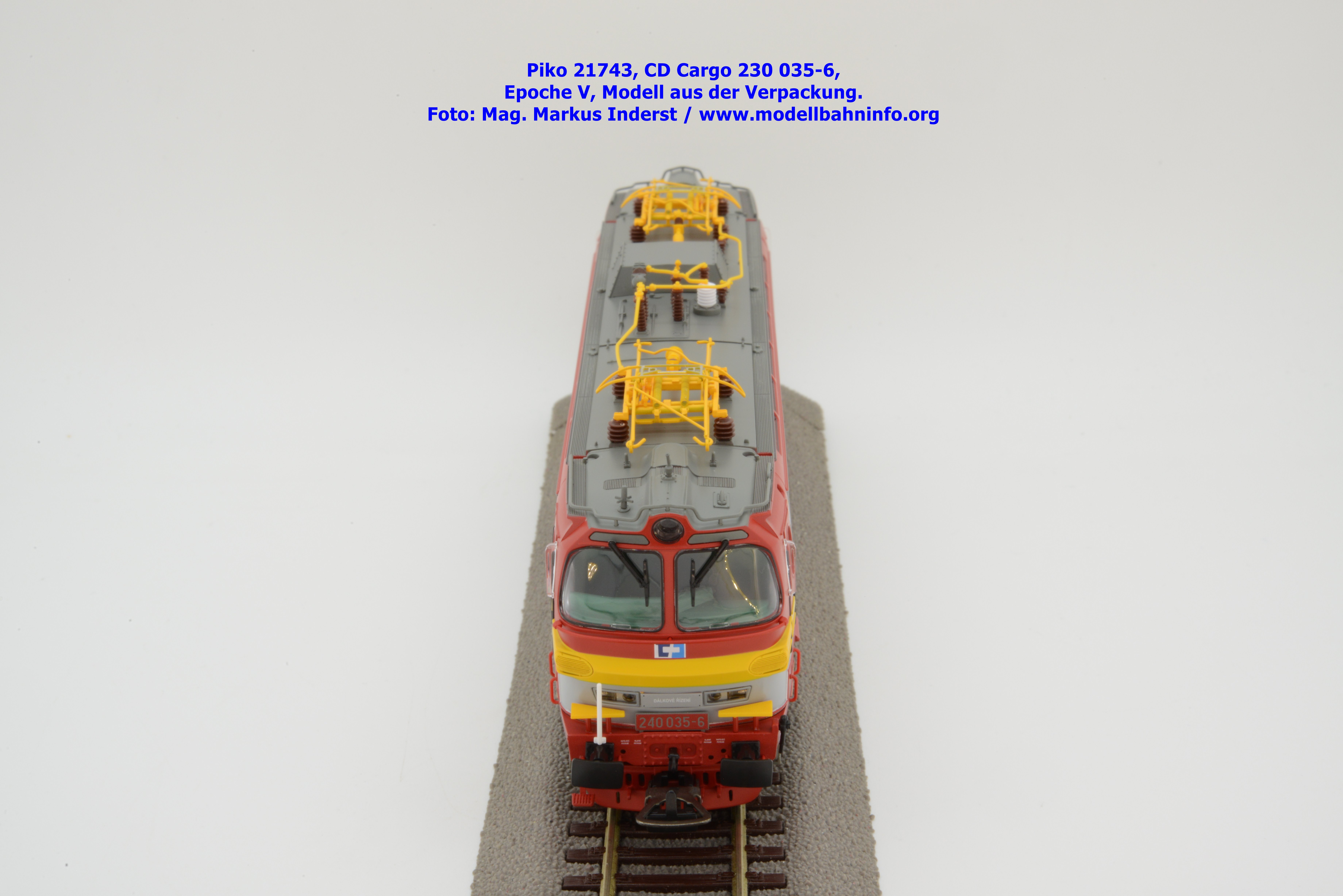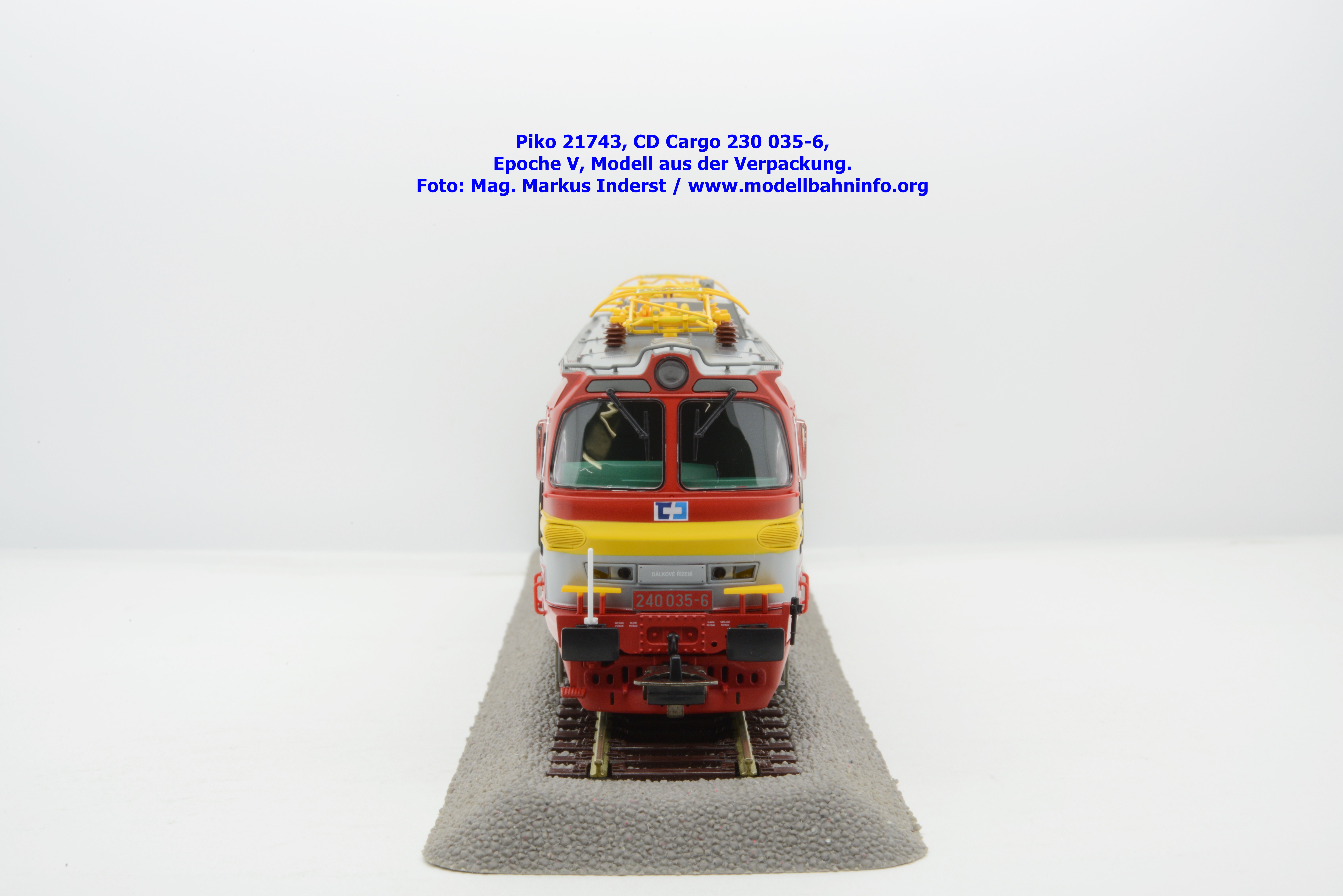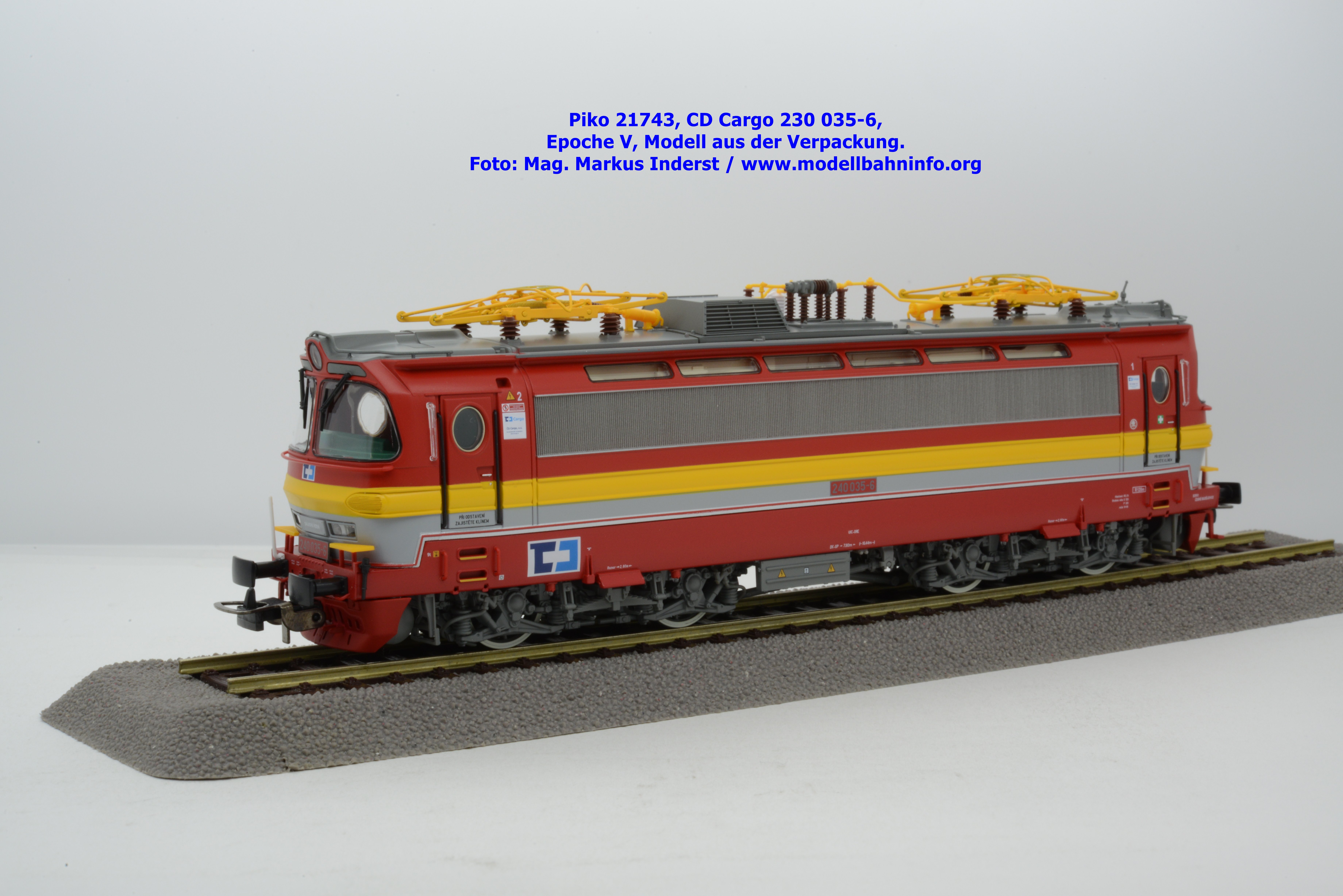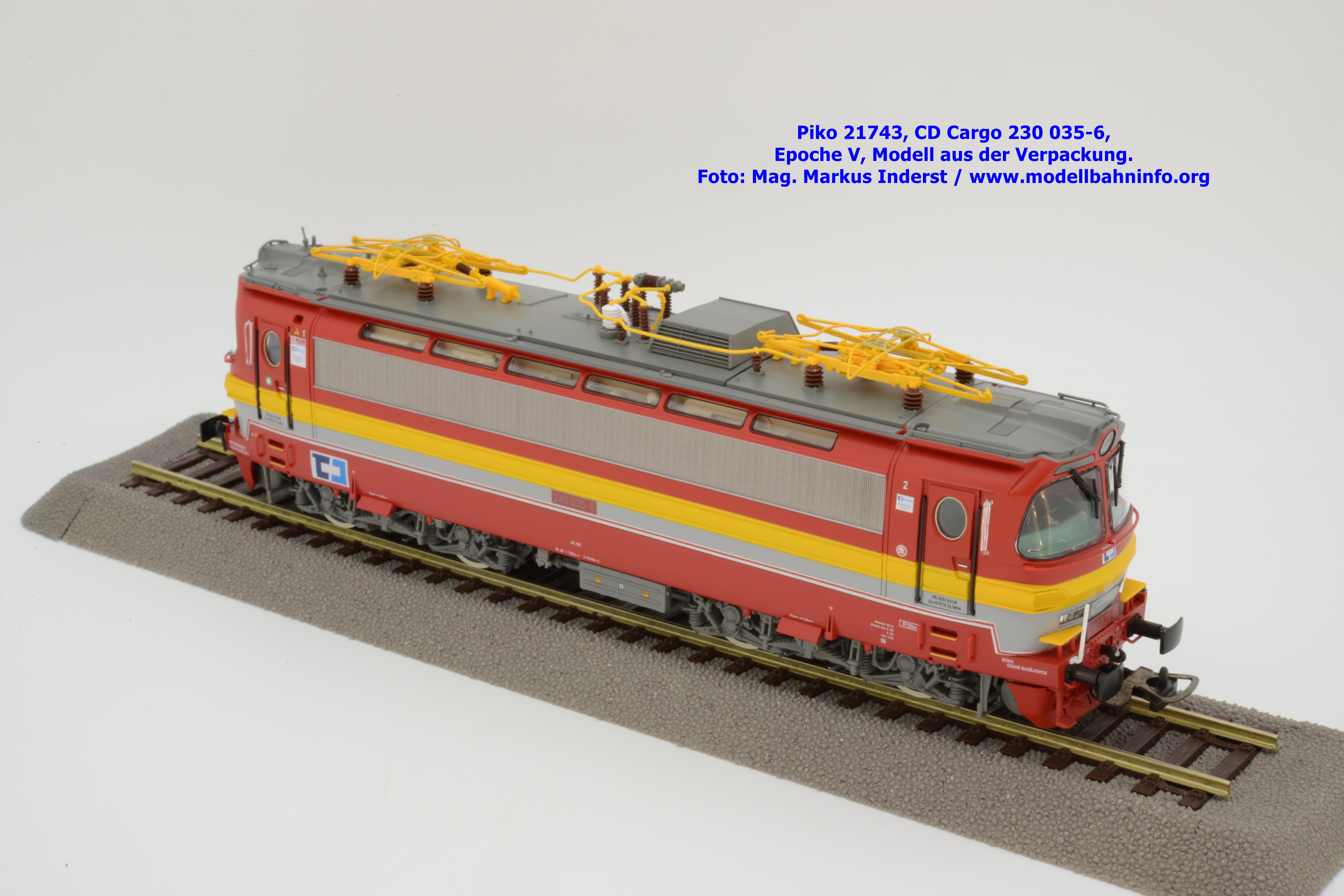 Mit diesem Modell erscheint ein Modell einer Laminatka in der Ursprungslackierung, welche aber durch die zusätzlichen Piktogramme von CD Cargo in die Ära der Epoche V fällt. Piko hat sich die 230 035-6 von CD Cargo zum Vorbild genommen, welche am Rahmen als auch neben den Führerstandstüren entsprechende Aufkleber zu den geänderten Eigentumsverhältnissen verfügt. Die Lok ist ebenfalls dem Depot Ceské Budéjovice beheimatet. Am Modell sind keine Untersuchungsfristen angeschrieben. Piko hat diese Modellausführung mit drei unterschiedlichen Ausführungen bedacht, indem unter der Artikelnummer 21743 die analoge Gleichstrom-Ausführung zum UVP von € 269,– bzw. unter der Artikelnummer 21744 die digitale Gleichstrom-Ausführung zum erhöhten UVP von € 379,– erhältlich ist. Für das Dreileiter-Wechselstrom-System liegt die mit Decoder ausgestattete Variante unter der Artikelnummer 21745 zur Verfügung.