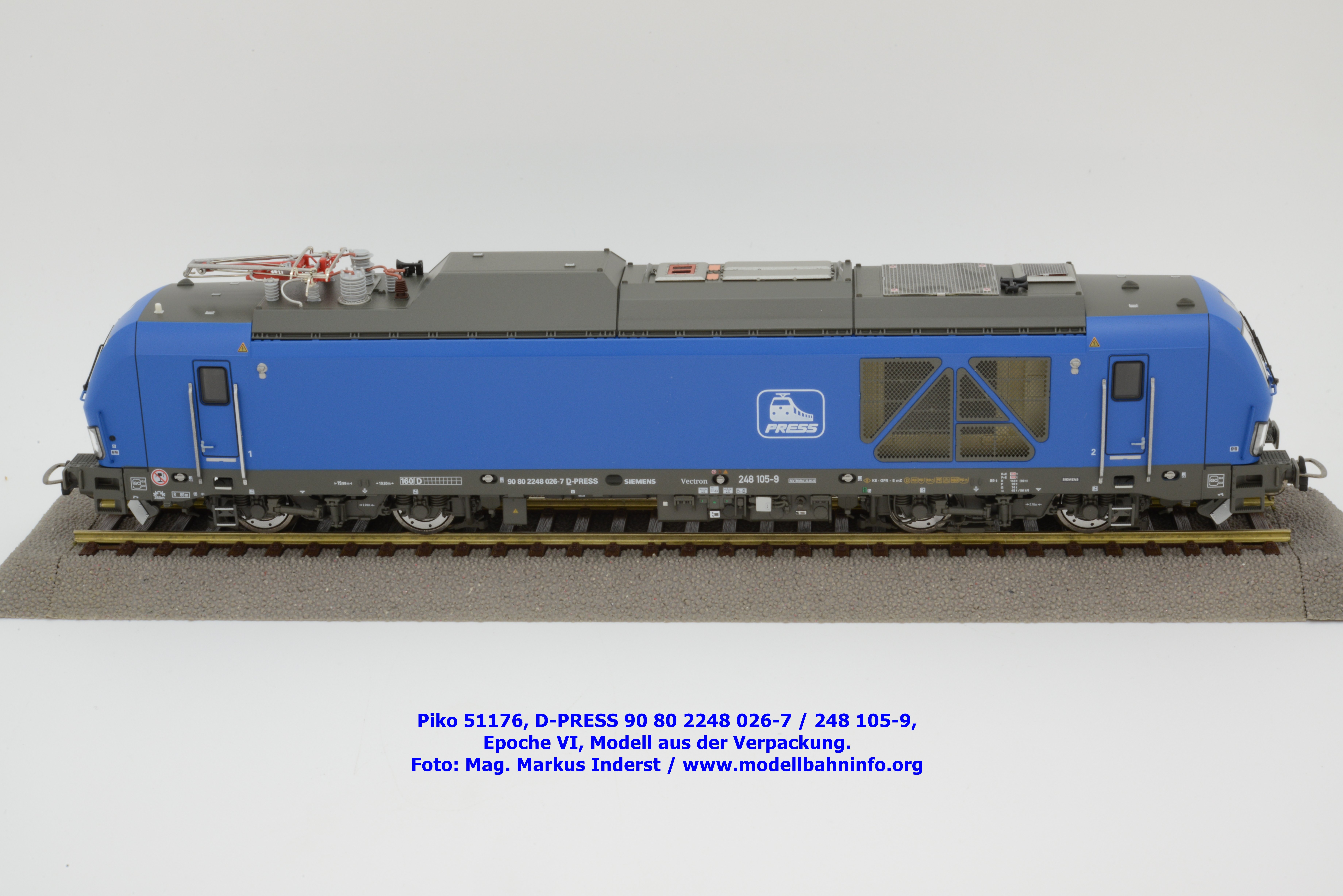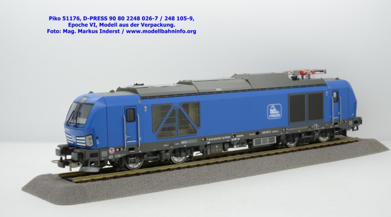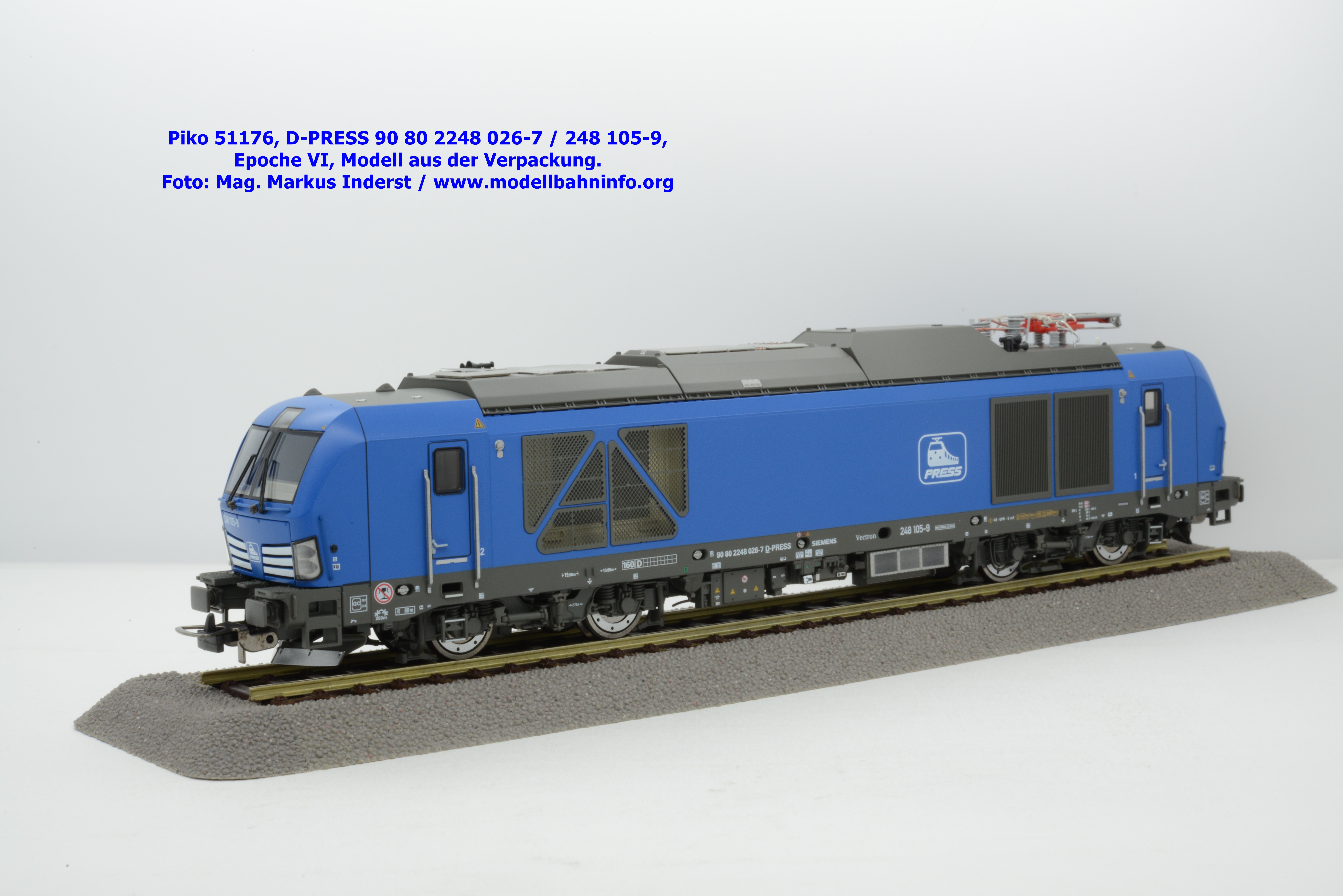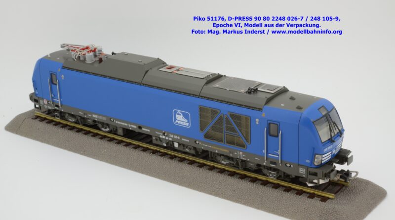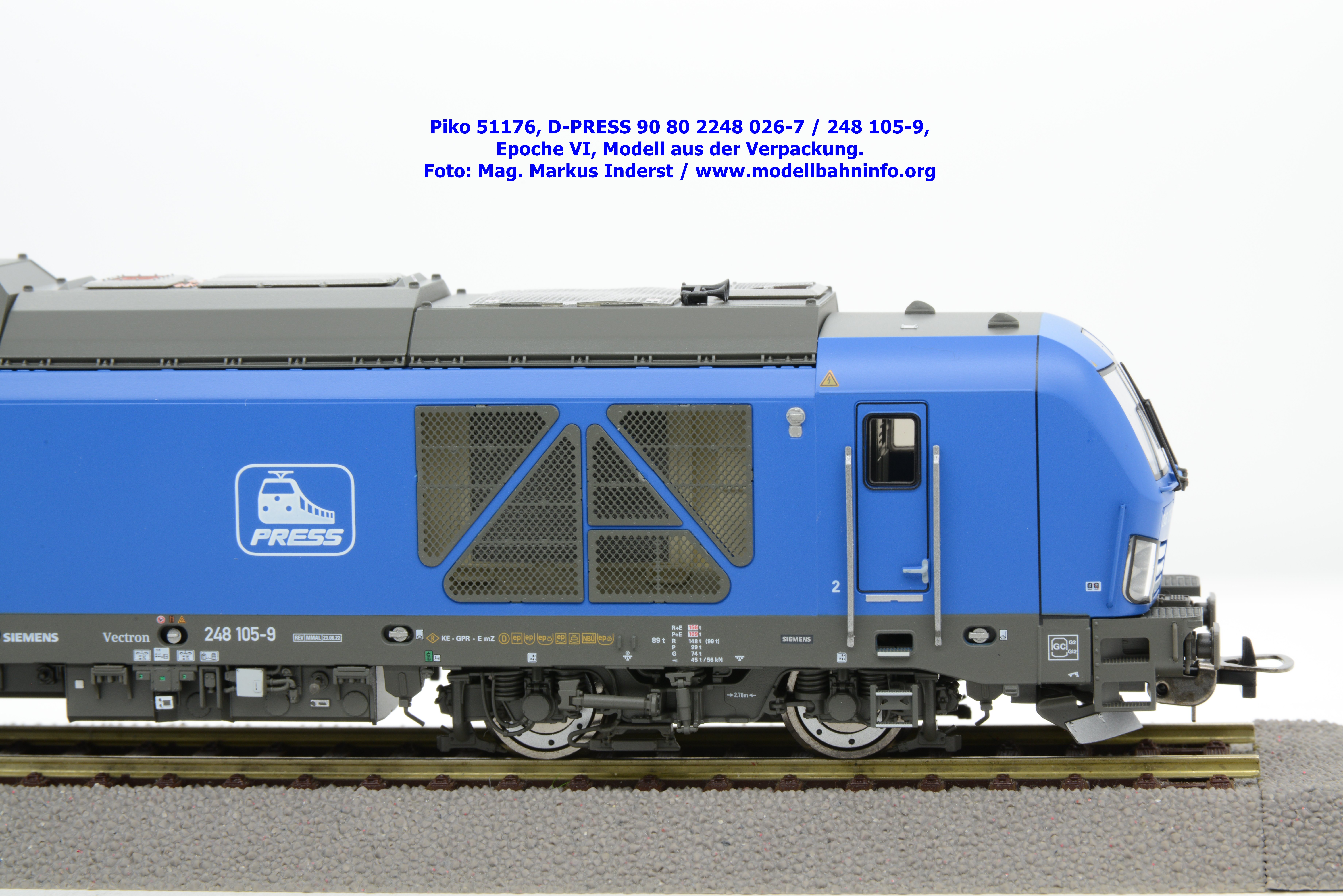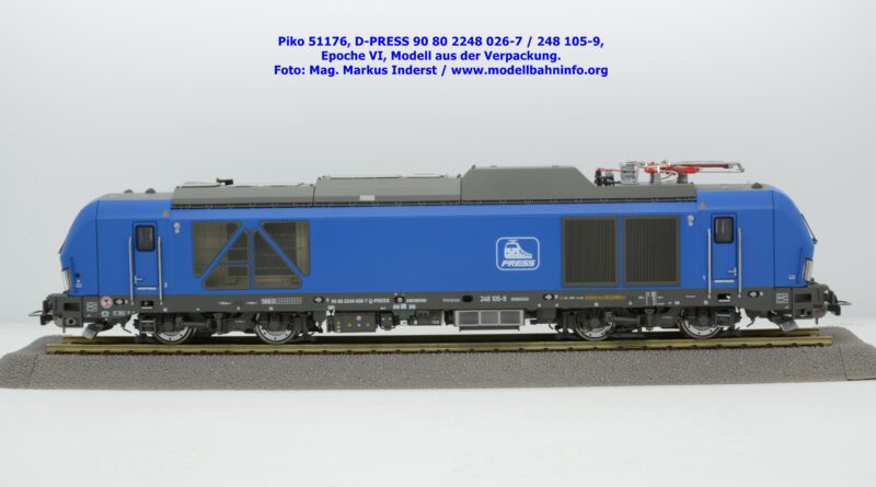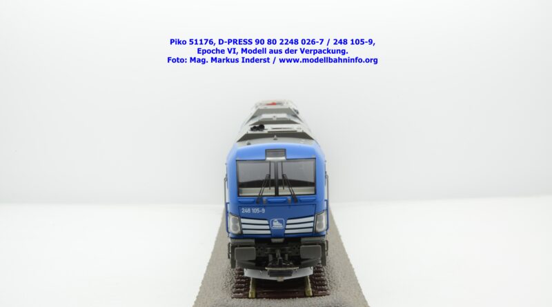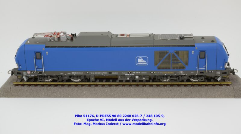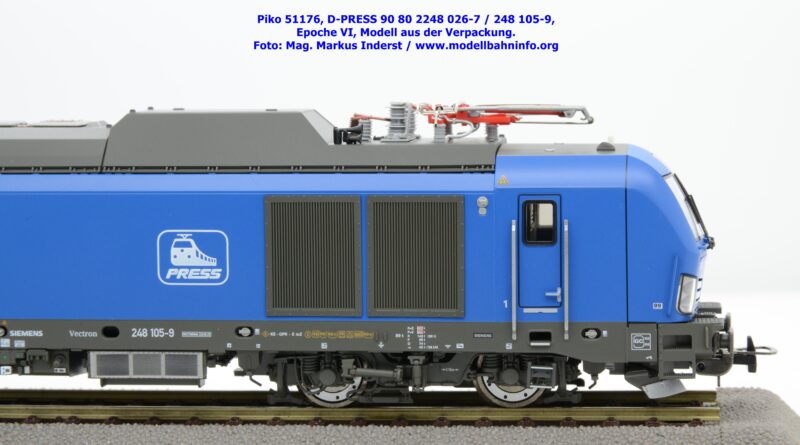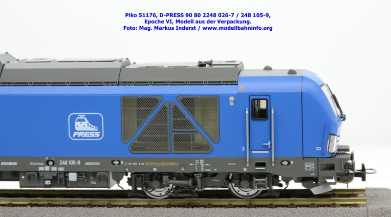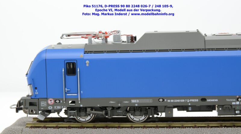 Das Eisenbahnverkehrsunternehmen Pressnitztal hat ebenfalls eine Siemens Dual Vectron in Betrieb genommen. Wie alle Lokomotiven von PRESS ist auch diese in dunkelblauer Farbgebung lackiert, ergänzt um das markante „Schienenfahrzeug“-Logo. Die Lok erhielt die Lokknummer 90 80 2248 026-7 und die Halterkennung D-PRESS. Zusätzlich ist noch die kurze Loknummer mit 248 105-9 angeschrieben, wobei unklar ist, welchen Zweck die Angabe von mehreren Loknummern am selben Fahrzeug erfüllt? Die 160 km/h schnelle Lok ist nur in Deuschland zugelassen. Die Untersuchungsdaten werden mit der Anschrift REV MMAL 23.06.22 wiedergegeben. Das Modell ist für das Zweileiter-Gleichstrom-System zum UVP von € 219,– angeboten, die Zweileiter-Wechselstrom-Ausführung ist unter der Artikelnummer 51177 und zum UVP von € 309,– erhältlich. Die Wechselstrom-Ausführung mit Loksound hat die Artikelnummer 51178.