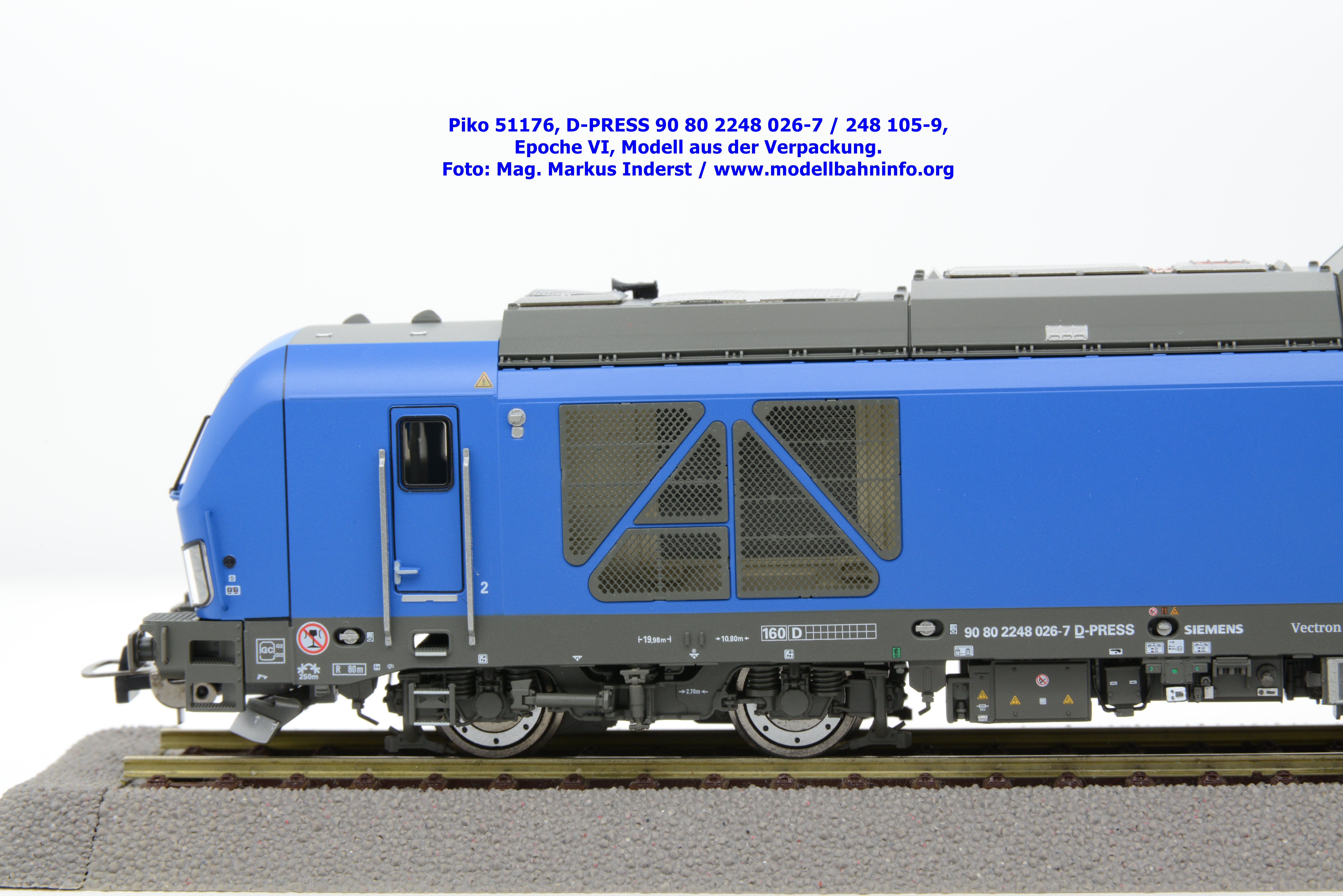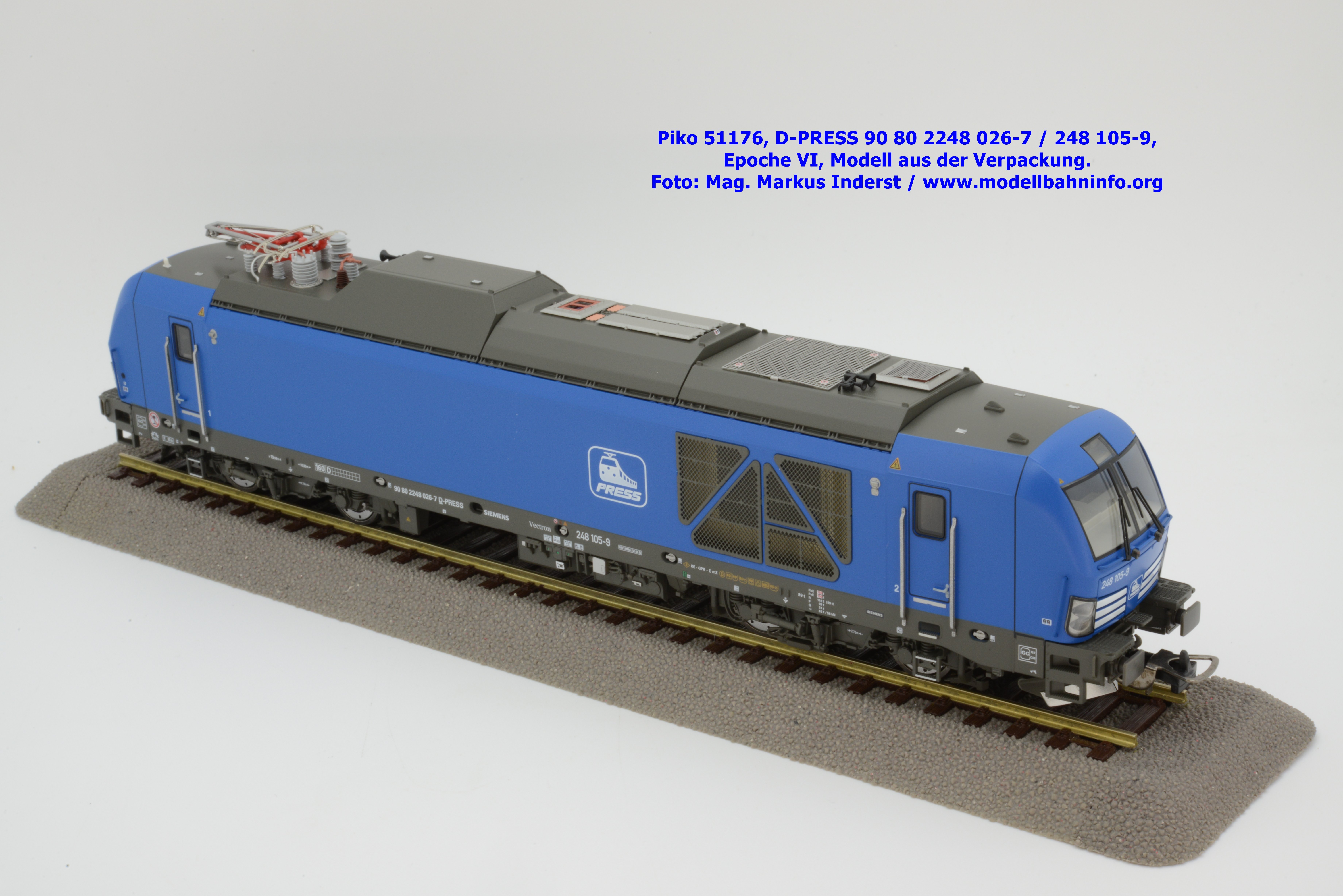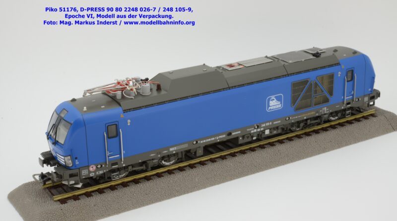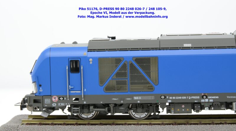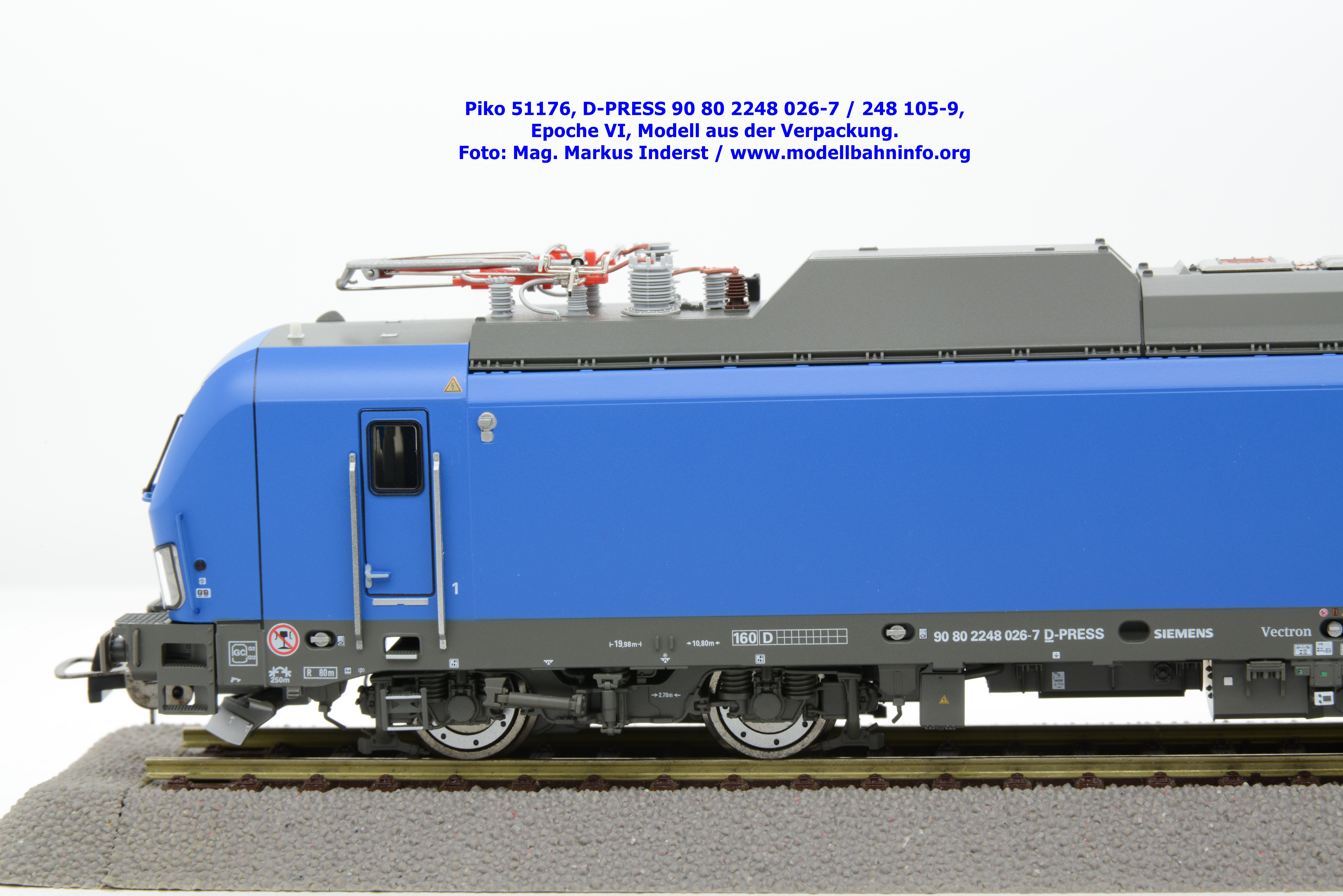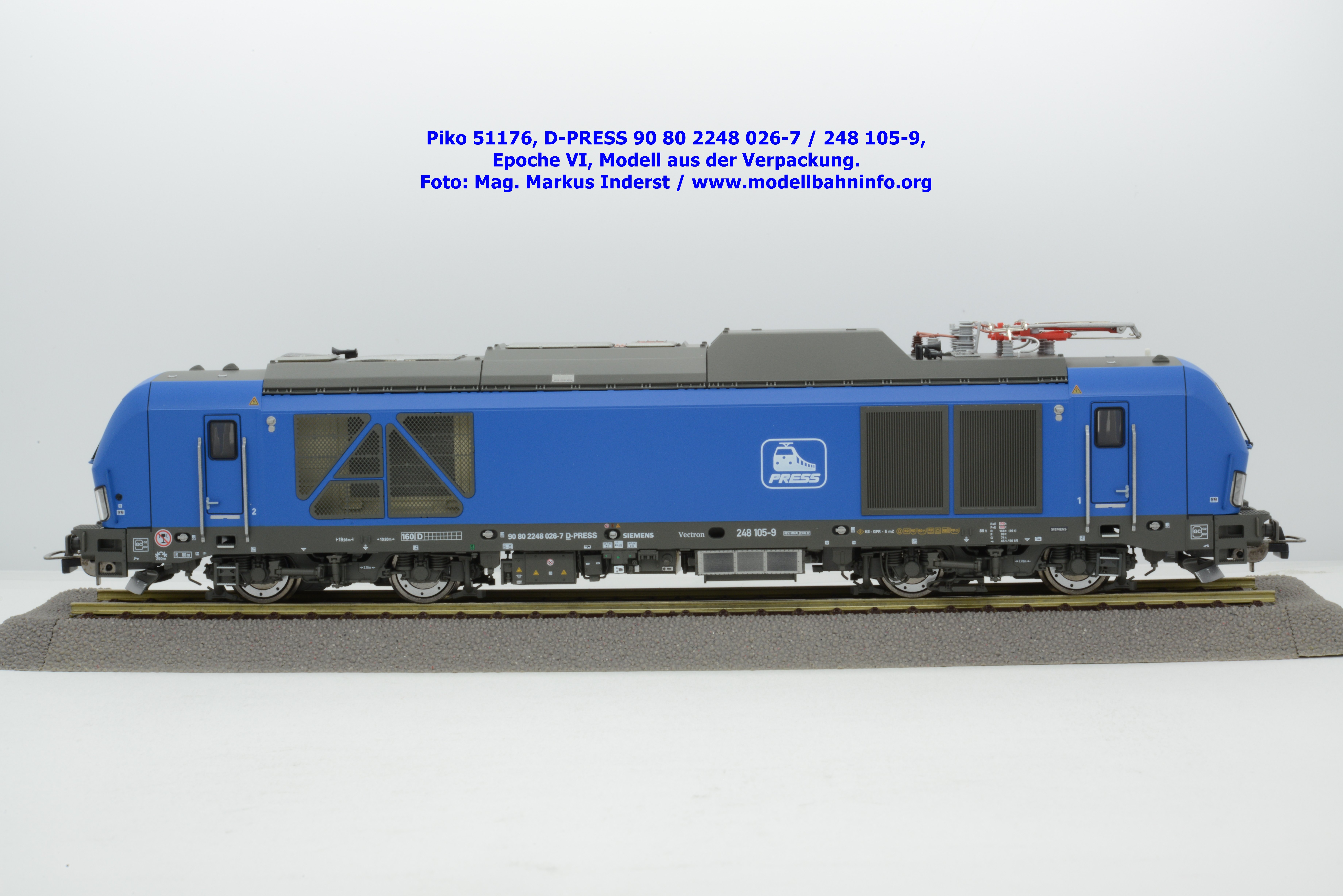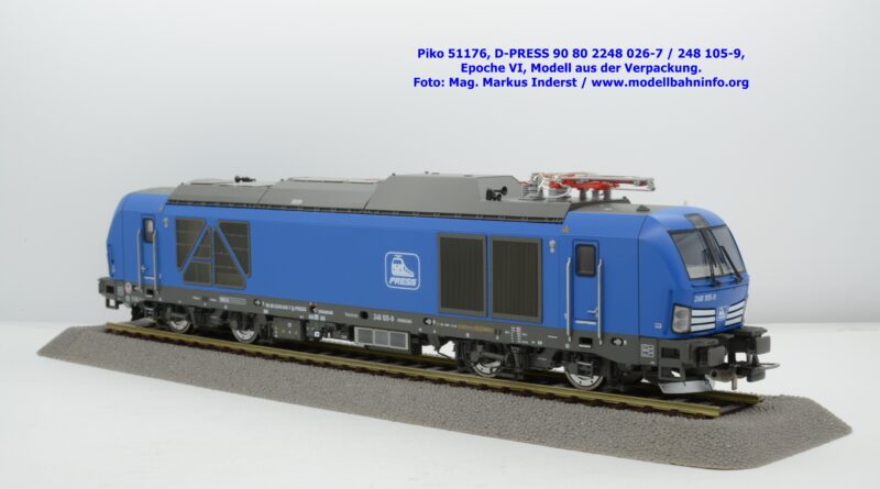 Das Eisenbahnverkehrsunternehmen Pressnitztal hat ebenfalls eine Siemens Dual Vectron in Betrieb genommen. Wie alle Lokomotiven von PRESS ist auch diese in dunkelblauer Farbgebung lackiert, ergänzt um das markante „Schienenfahrzeug“-Logo. Die Lok erhielt die Lokknummer 90 80 2248 026-7 und die Halterkennung D-PRESS. Zusätzlich ist noch die kurze Loknummer mit 248 105-9 angeschrieben, wobei unklar ist, welchen Zweck die Angabe von mehreren Loknummern am selben Fahrzeug erfüllt? Die 160 km/h schnelle Lok ist nur in Deuschland zugelassen. Die Untersuchungsdaten werden mit der Anschrift REV MMAL 23.06.22 wiedergegeben. Das Modell ist für das Zweileiter-Gleichstrom-System zum UVP von € 219,– angeboten, die Zweileiter-Wechselstrom-Ausführung ist unter der Artikelnummer 51177 und zum UVP von € 309,– erhältlich. Die Wechselstrom-Ausführung mit Loksound hat die Artikelnummer 51178.