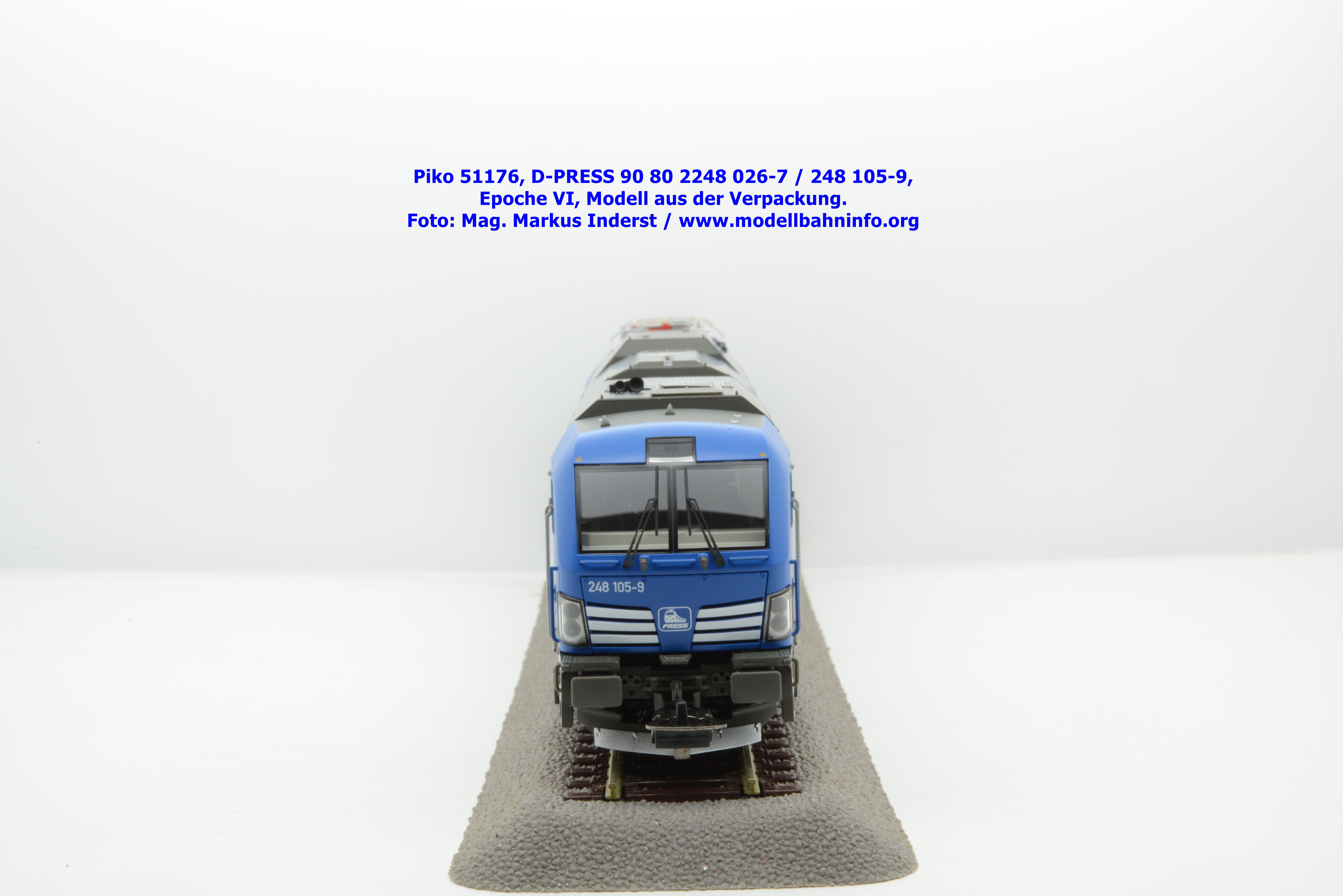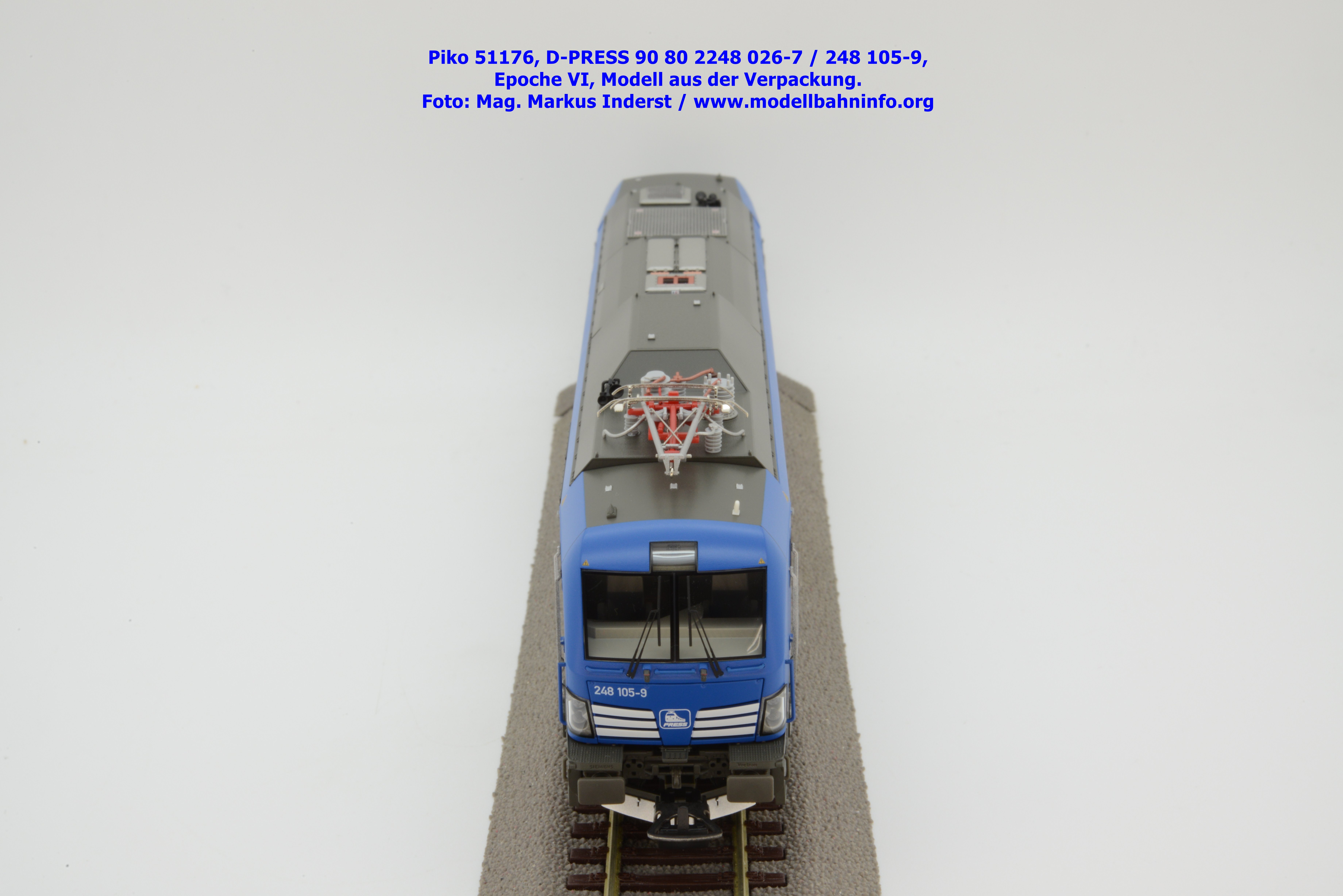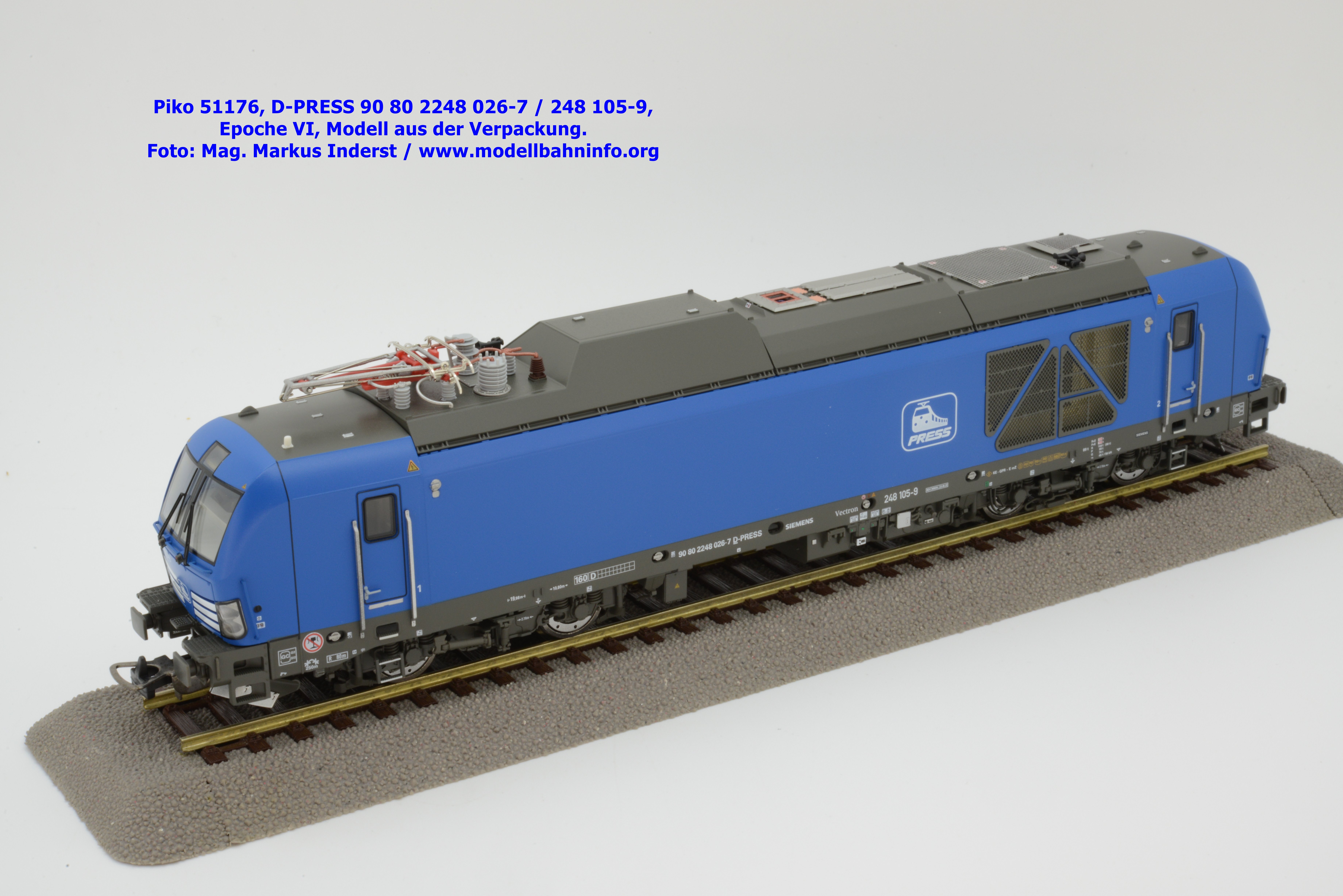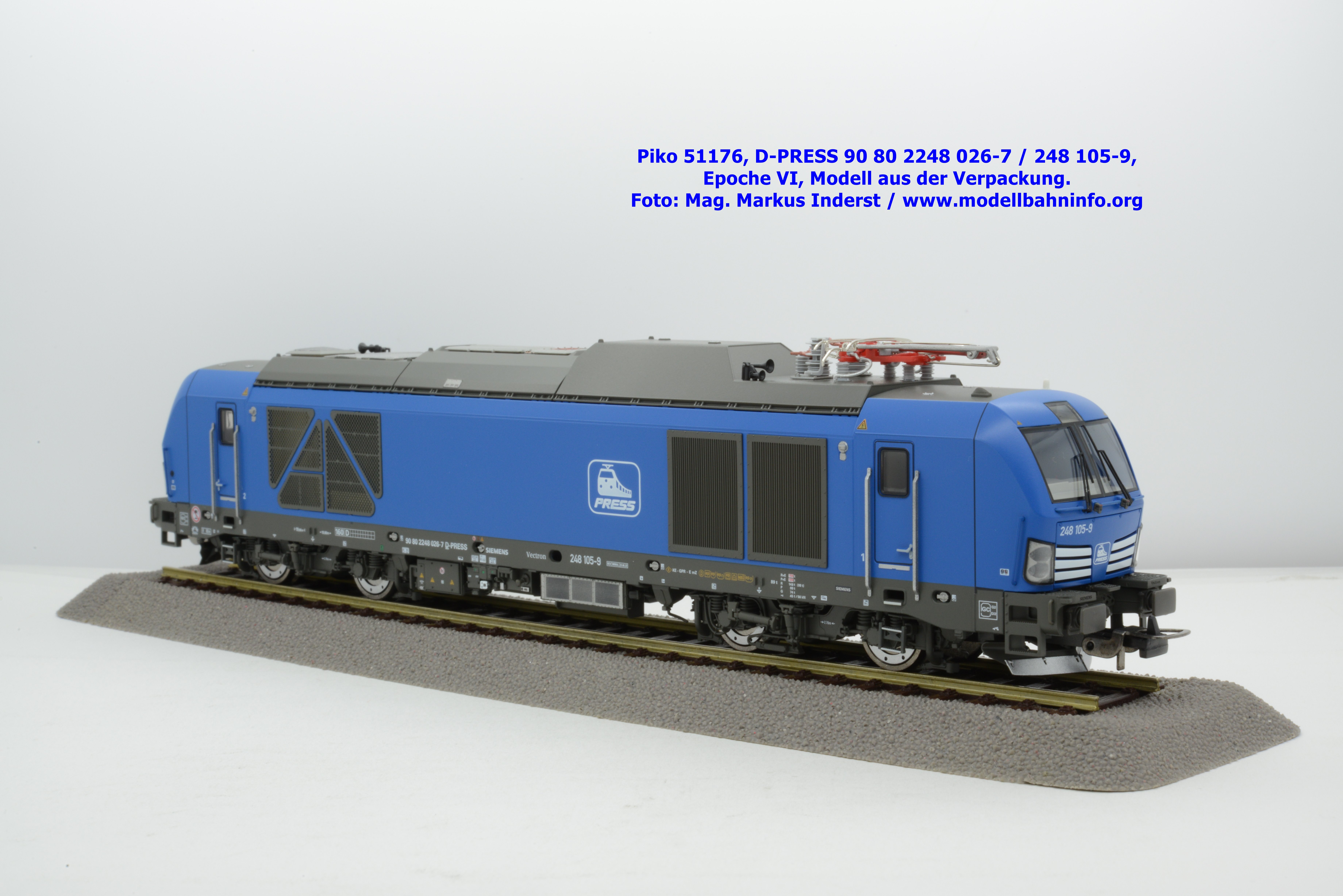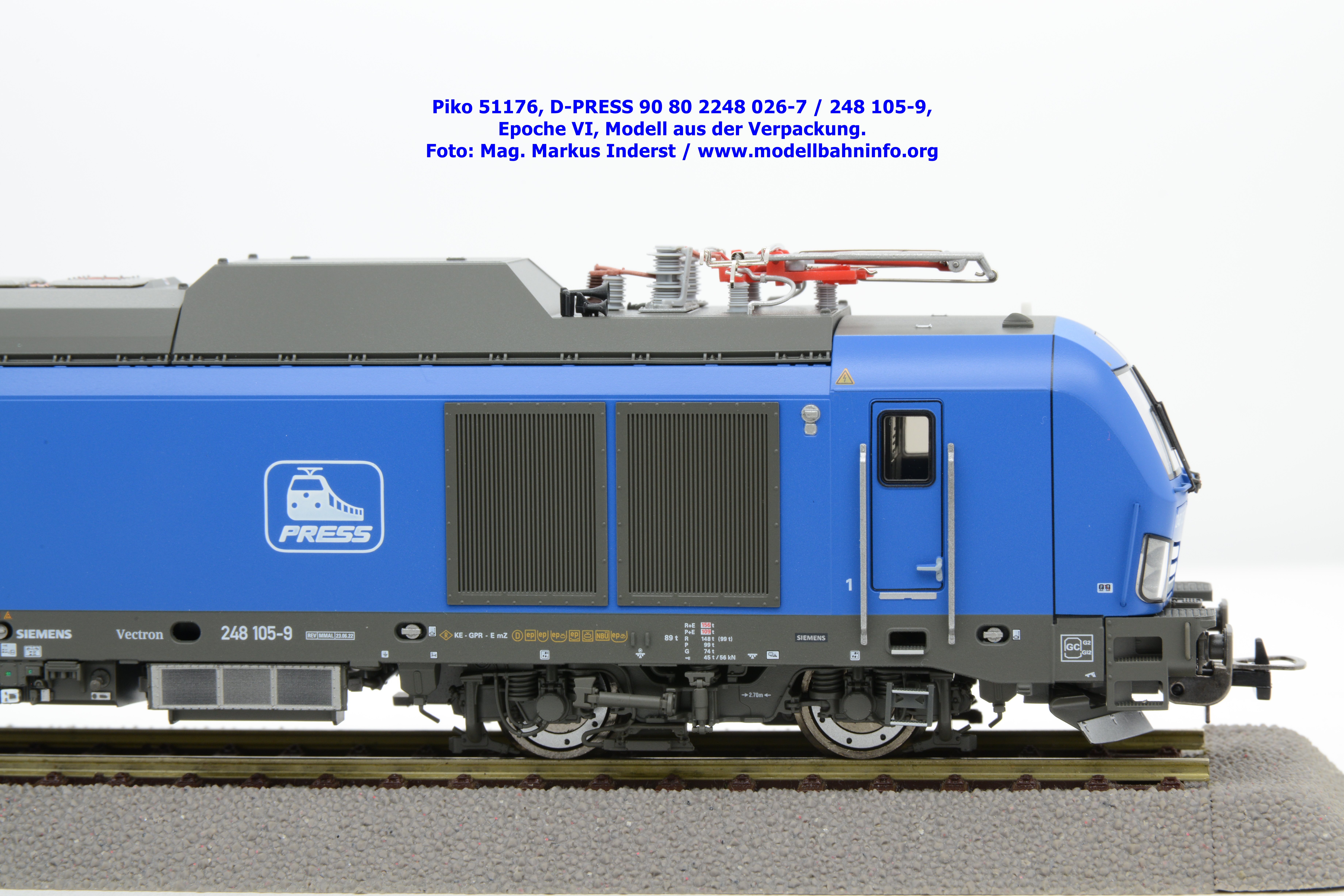 Das Eisenbahnverkehrsunternehmen Pressnitztal hat ebenfalls eine Siemens Dual Vectron in Betrieb genommen. Wie alle Lokomotiven von PRESS ist auch diese in dunkelblauer Farbgebung lackiert, ergänzt um das markante „Schienenfahrzeug“-Logo. Die Lok erhielt die Lokknummer 90 80 2248 026-7 und die Halterkennung D-PRESS. Zusätzlich ist noch die kurze Loknummer mit 248 105-9 angeschrieben, wobei unklar ist, welchen Zweck die Angabe von mehreren Loknummern am selben Fahrzeug erfüllt? Die 160 km/h schnelle Lok ist nur in Deuschland zugelassen. Die Untersuchungsdaten werden mit der Anschrift REV MMAL 23.06.22 wiedergegeben. Das Modell ist für das Zweileiter-Gleichstrom-System zum UVP von € 219,– angeboten, die Zweileiter-Wechselstrom-Ausführung ist unter der Artikelnummer 51177 und zum UVP von € 309,– erhältlich. Die Wechselstrom-Ausführung mit Loksound hat die Artikelnummer 51178.