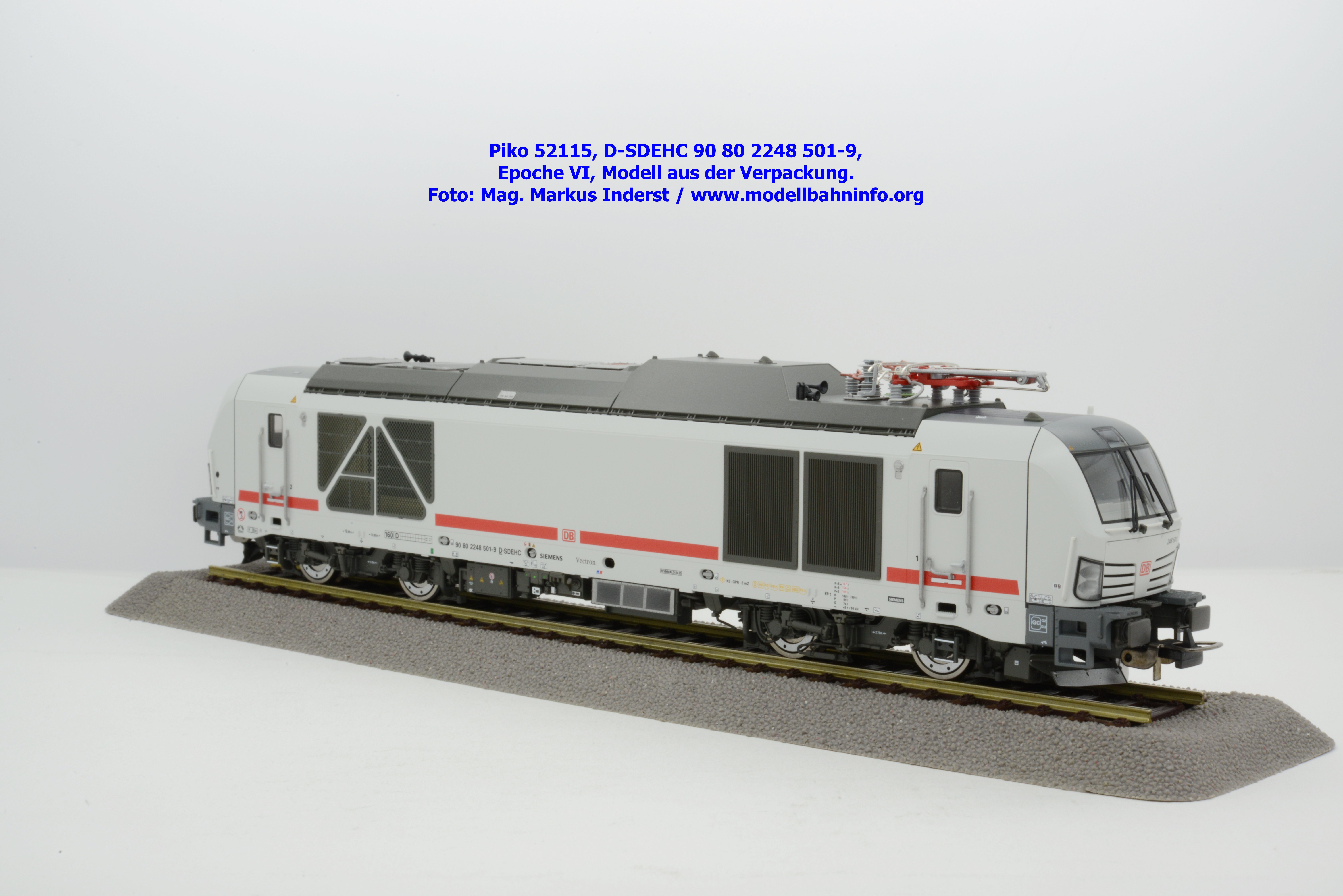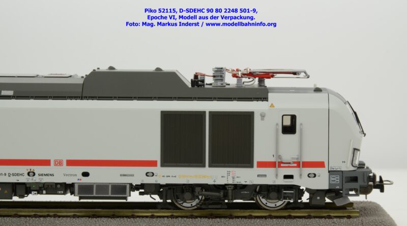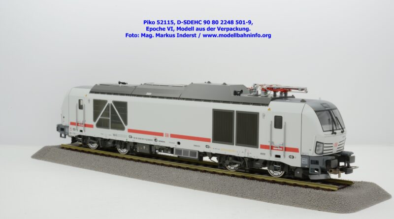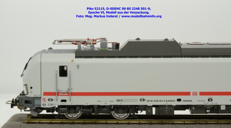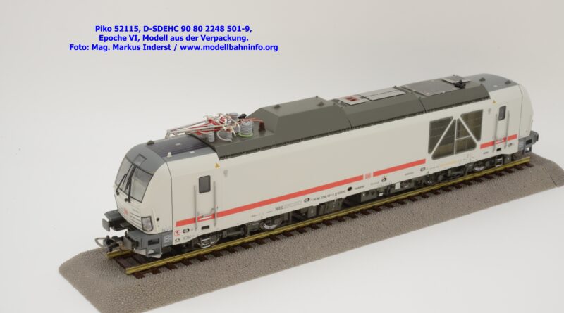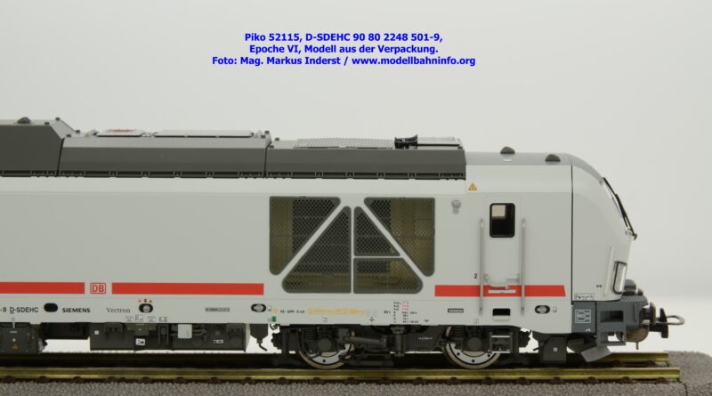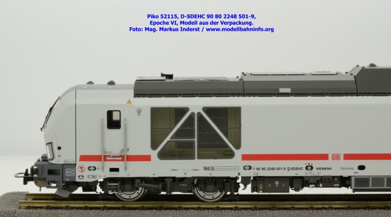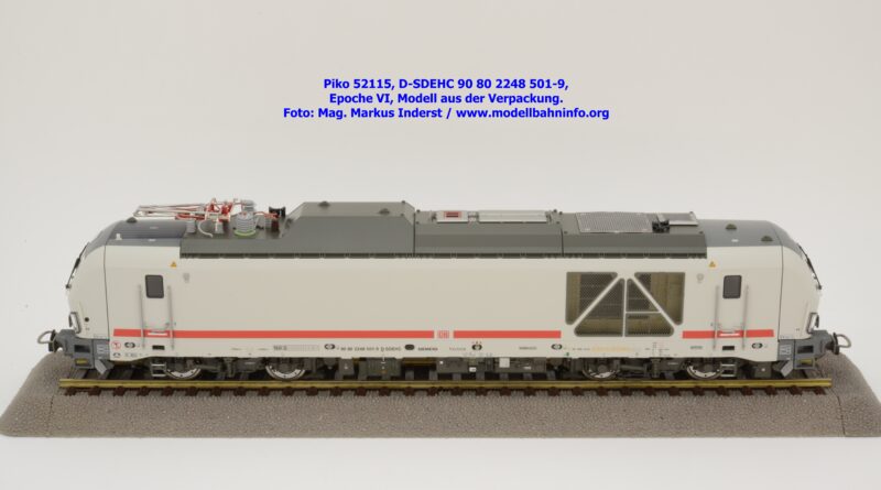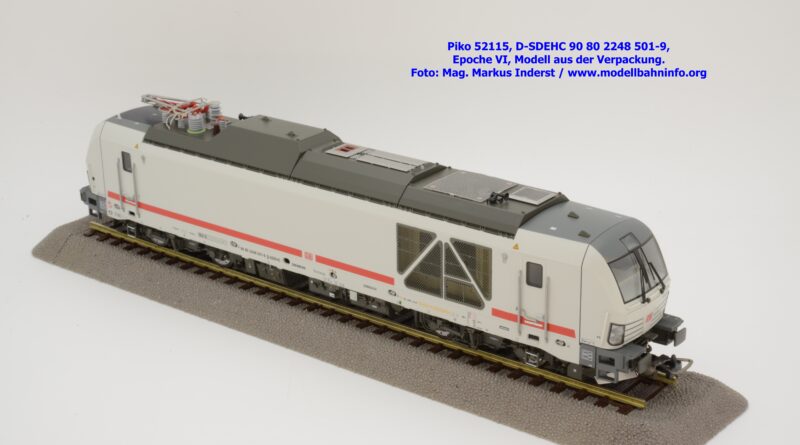 Die DB AG hat sich auch Zweikraftlokomotiven der Baureihe 248 im IC-Farbschema zugelegt und diese mit der Baureihenbezeichnung 248.5 in den Bestand eingereiht. Die von Siemens stammende Lok ist lichtgrau lackiert und weist einen verkehrsroten Kontraststreifen an den Seitenwänden auf. Das Modell ist mit den NVR-Anschriften 90 80 2248 501-9 D-SDEHC versehen, im Revisionsraster stehen die Abnahmedaten REV MMAL 24.04.25. Zum Zeitpunkt der Ankündigung war nur klar, daß drei Modellausführungen produziert werden, ohne dazu einen Preis anzuführen. Das besagte Modell ist unter der Artikelnummer 52115 für das Zweileiter-Gleichstrom-System ohne Digitaldecoder zum UVP von € 219,– erhältlich. Die Zweileiter-Gleichstrom-Ausführung mit Digitaldecoder bzw. Piko TrainSound onboard wird unter der Artikelnummer 52116 und zum UVP von € 329,– geführt. Die Dreileiter-Wechselstrom-Ausführung mit Piko TrainSound onboard ist unter der Artikelnummer 52117 zum gleichen UVP zu haben.