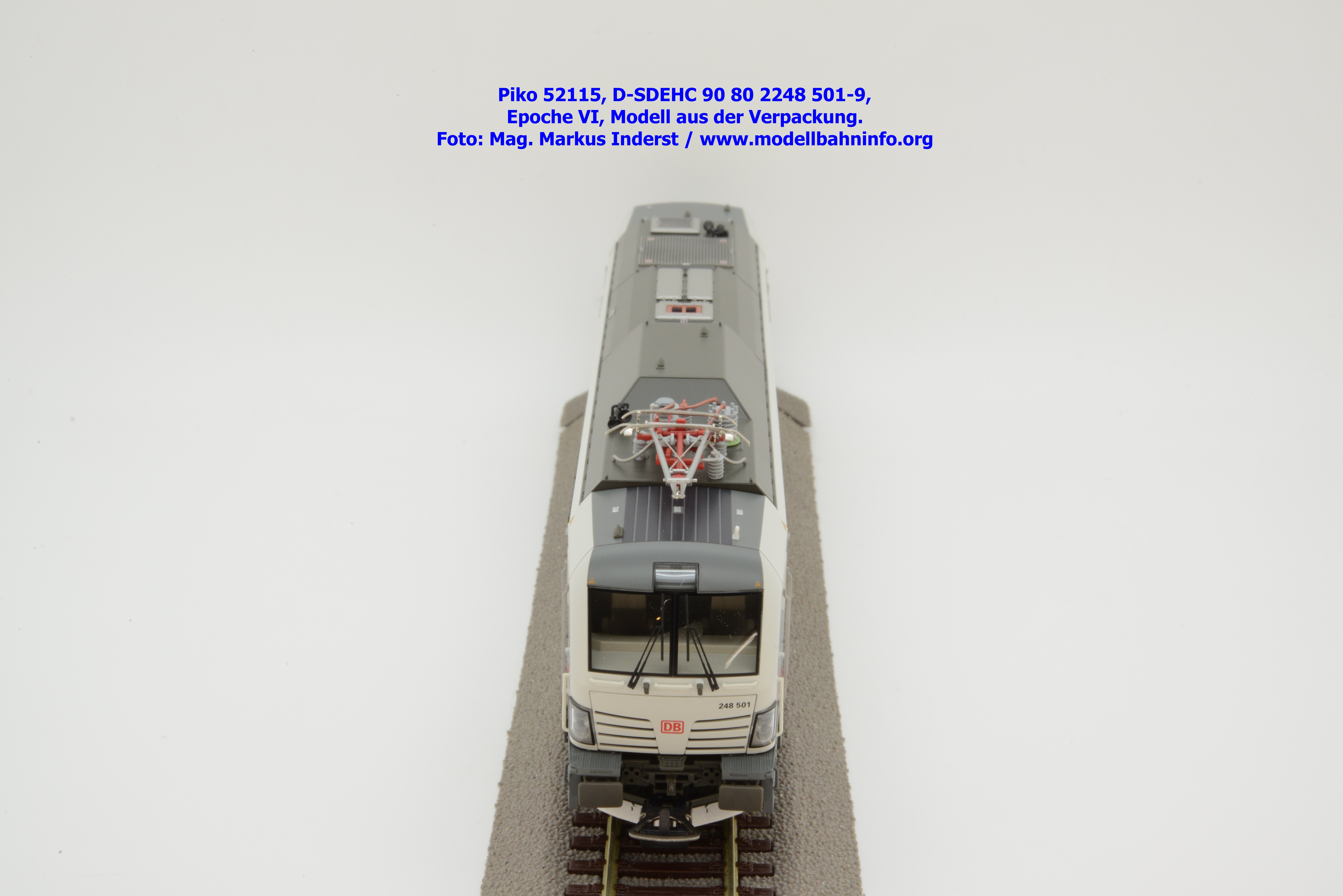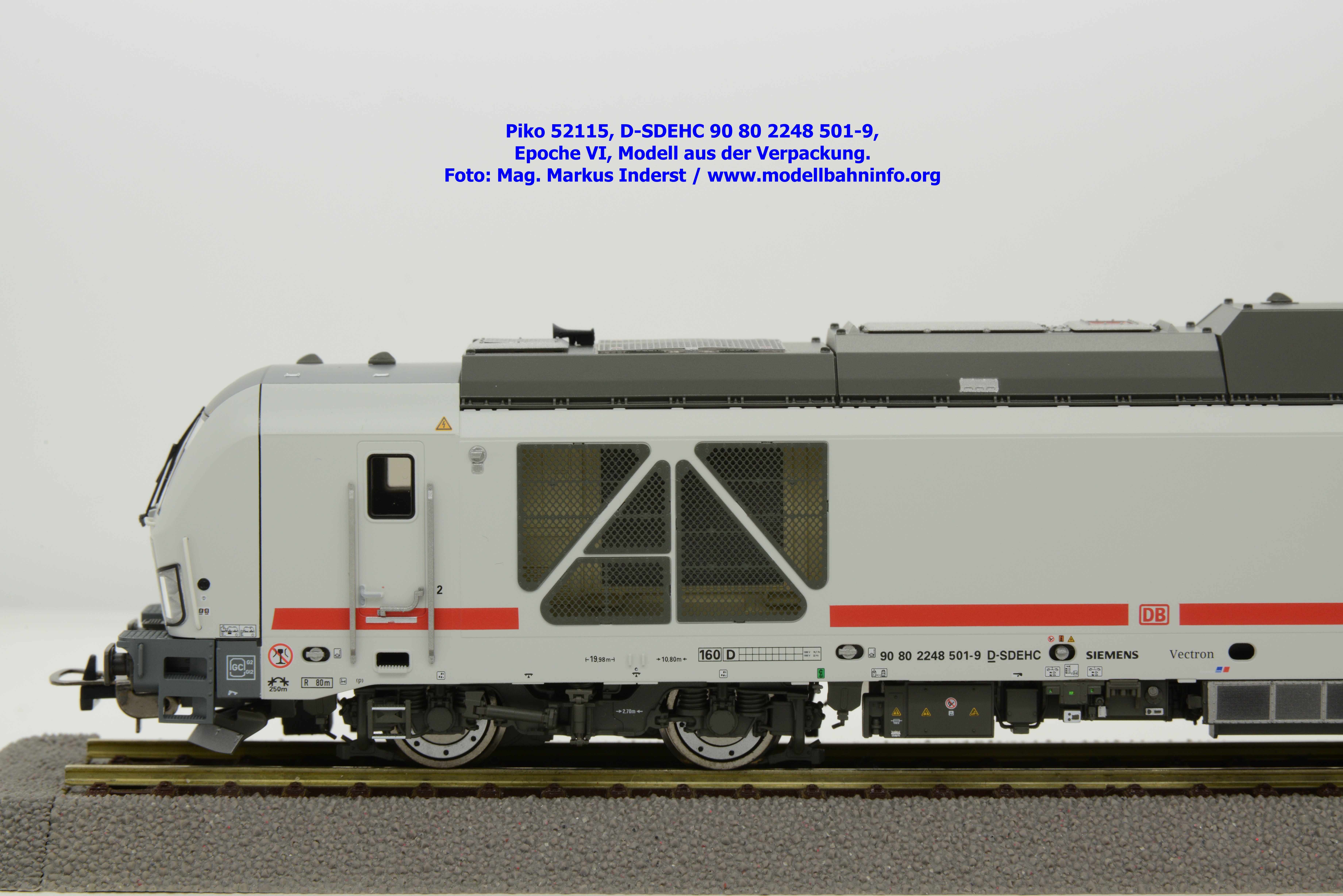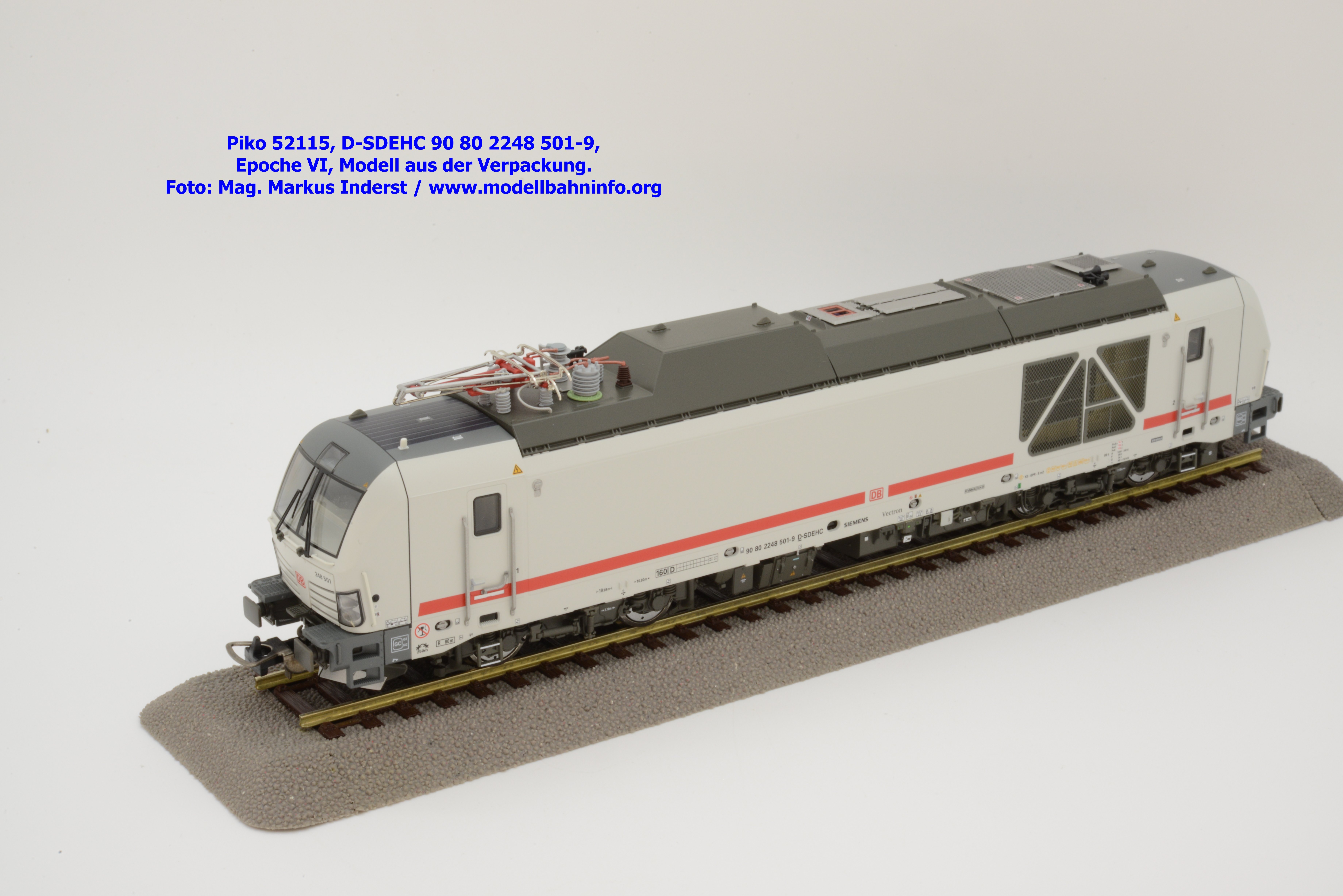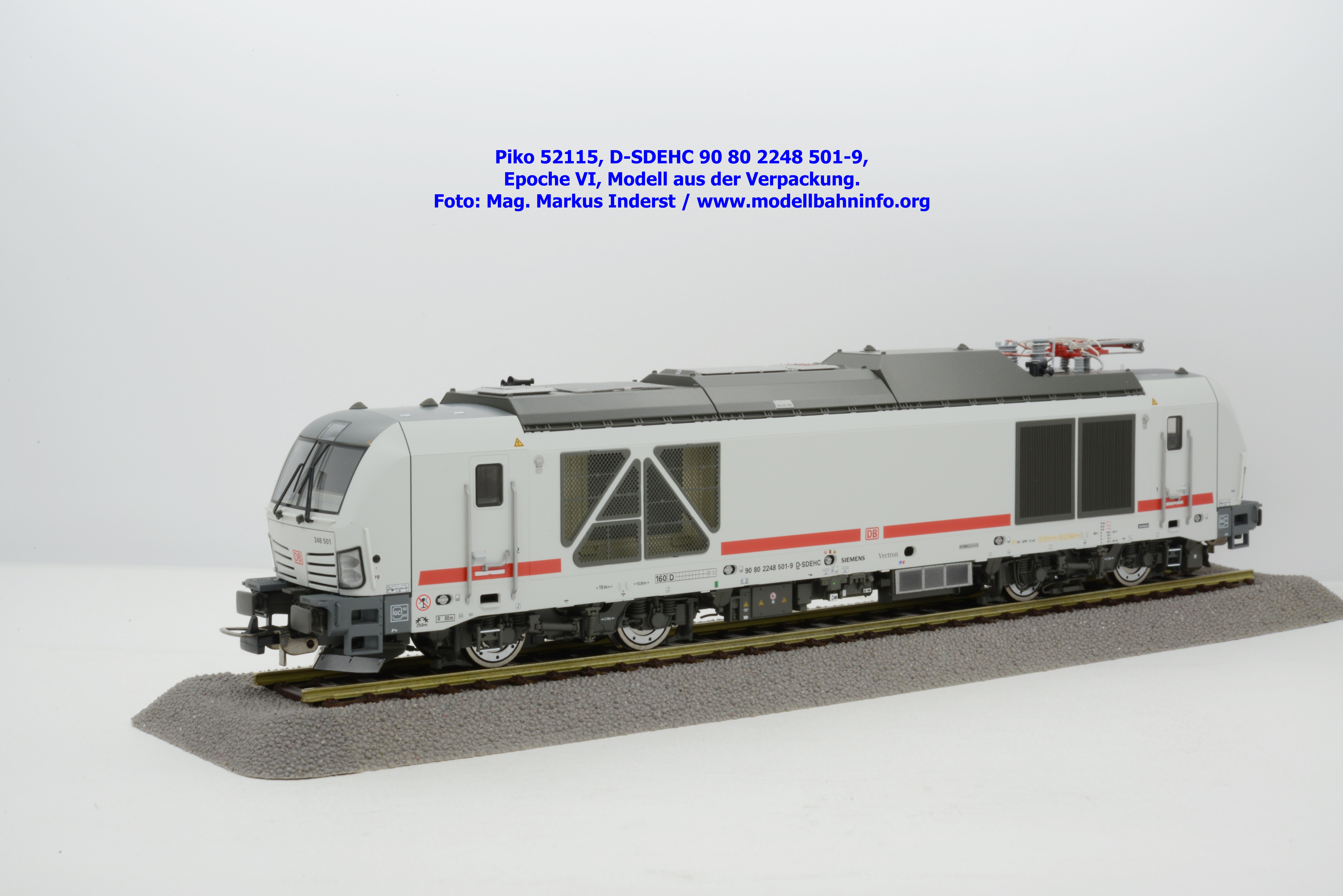 Die DB AG hat sich auch Zweikraftlokomotiven der Baureihe 248 im IC-Farbschema zugelegt und diese mit der Baureihenbezeichnung 248.5 in den Bestand eingereiht. Die von Siemens stammende Lok ist lichtgrau lackiert und weist einen verkehrsroten Kontraststreifen an den Seitenwänden auf. Das Modell ist mit den NVR-Anschriften 90 80 2248 501-9 D-SDEHC versehen, im Revisionsraster stehen die Abnahmedaten REV MMAL 24.04.25. Zum Zeitpunkt der Ankündigung war nur klar, daß drei Modellausführungen produziert werden, ohne dazu einen Preis anzuführen. Das besagte Modell ist unter der Artikelnummer 52115 für das Zweileiter-Gleichstrom-System ohne Digitaldecoder zum UVP von € 219,– erhältlich. Die Zweileiter-Gleichstrom-Ausführung mit Digitaldecoder bzw. Piko TrainSound onboard wird unter der Artikelnummer 52116 und zum UVP von € 329,– geführt. Die Dreileiter-Wechselstrom-Ausführung mit Piko TrainSound onboard ist unter der Artikelnummer 52117 zum gleichen UVP zu haben.