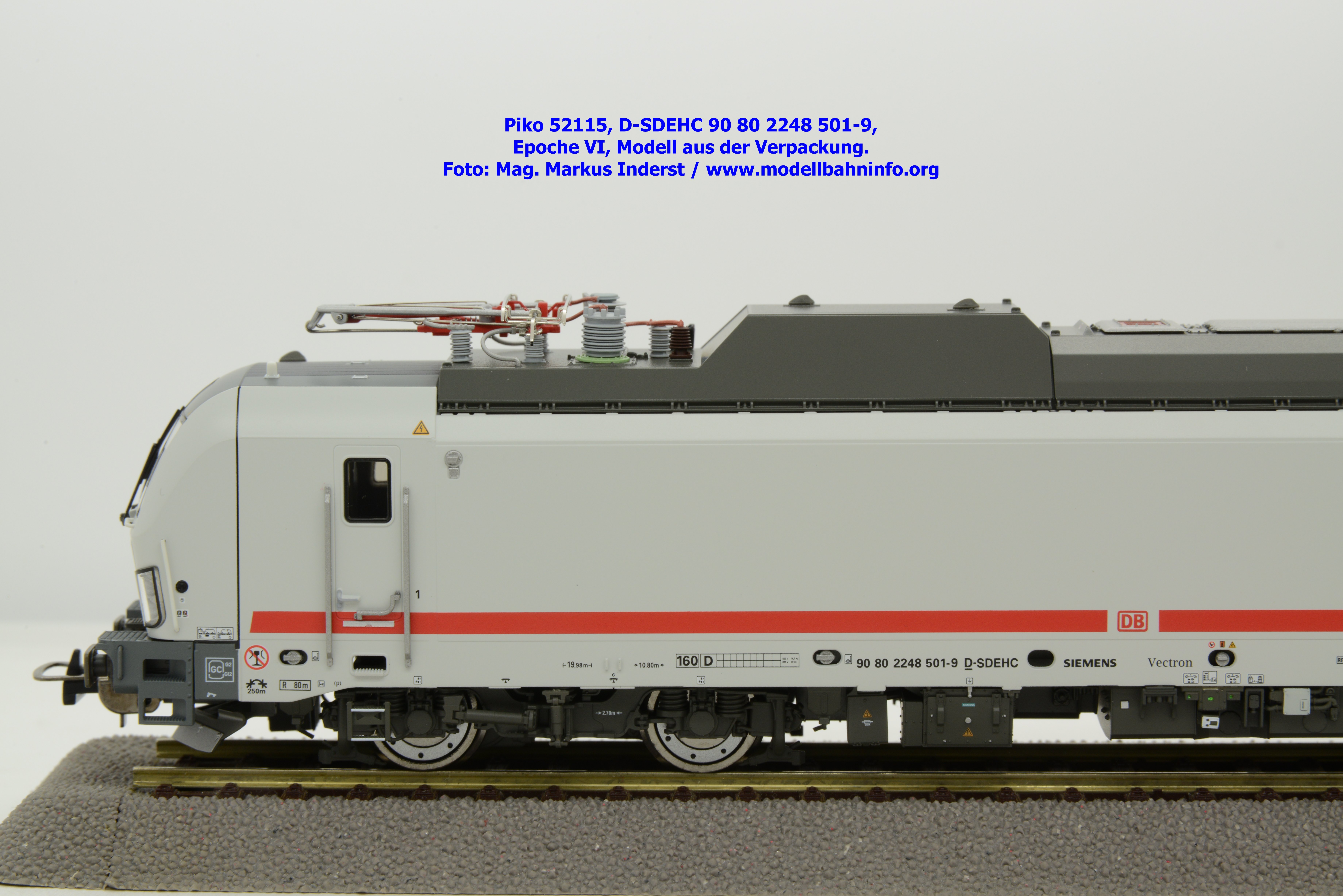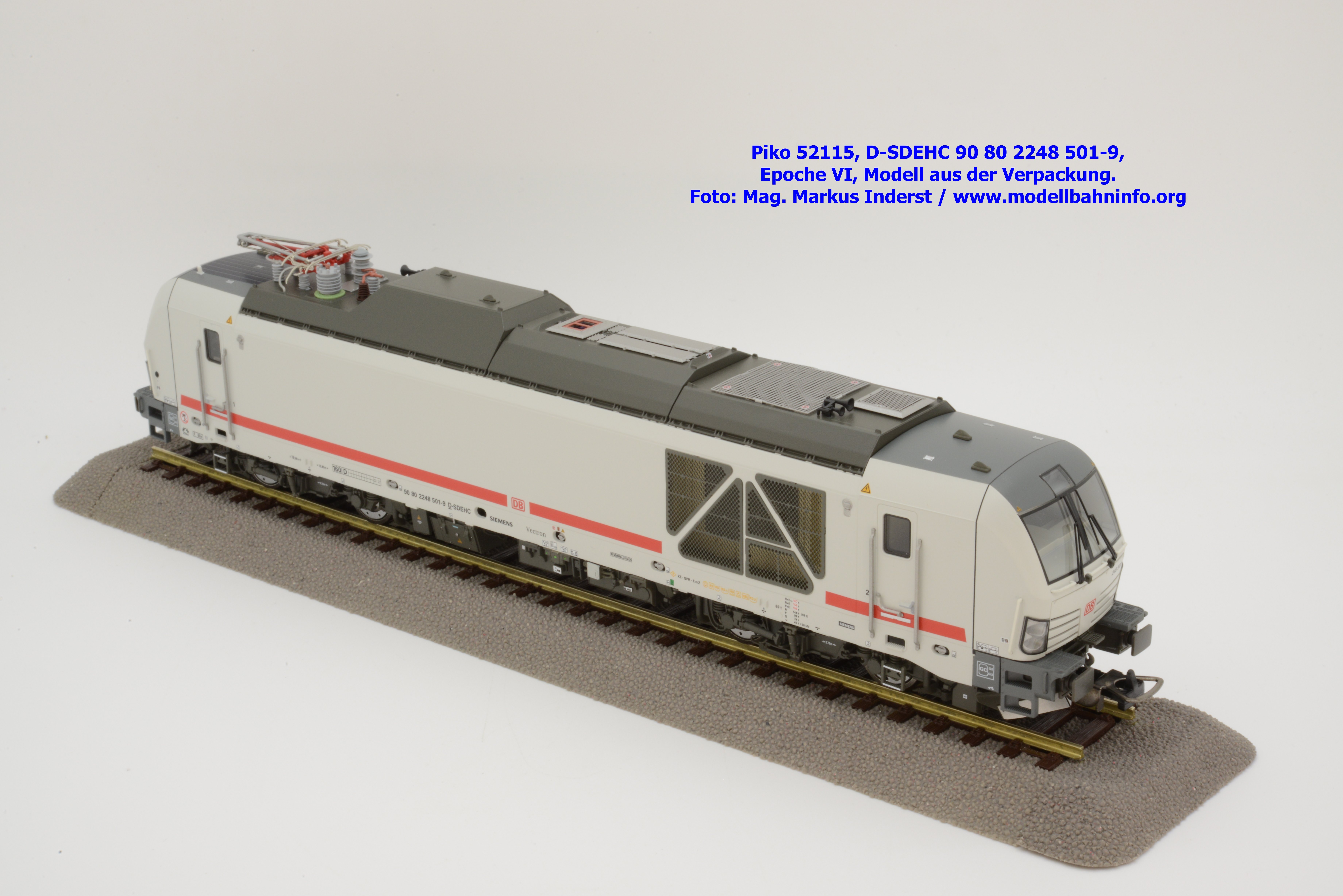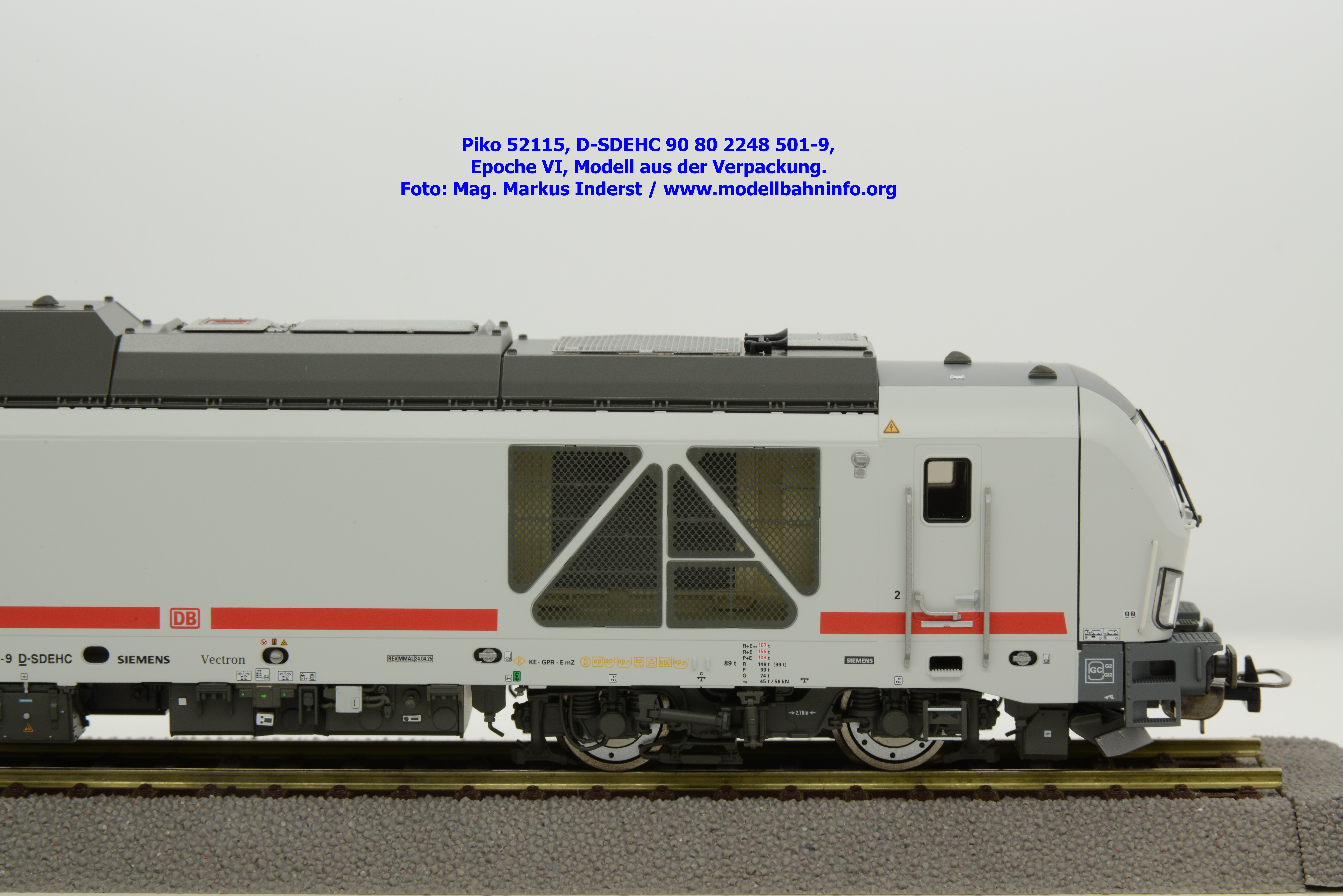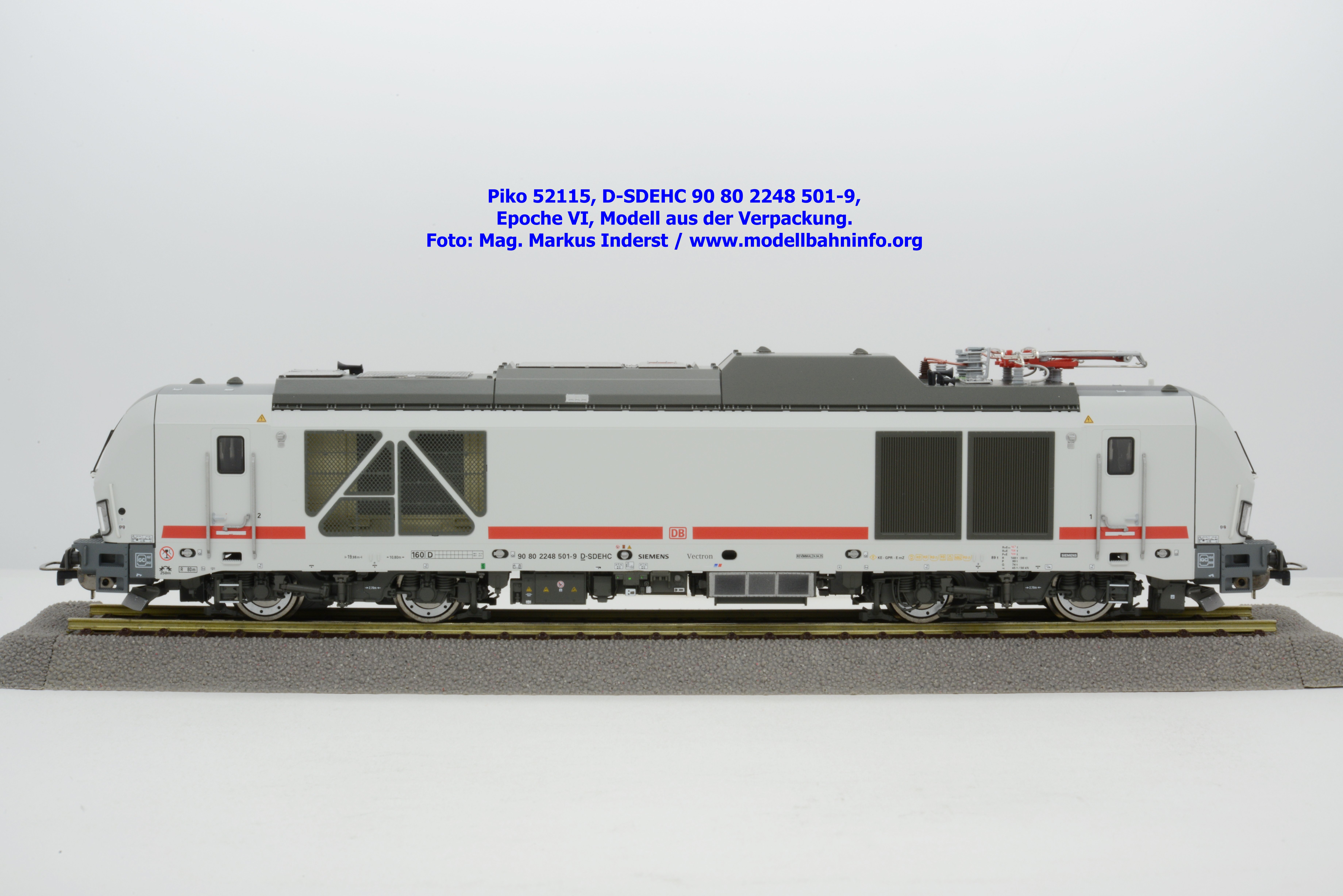 Die DB AG hat sich auch Zweikraftlokomotiven der Baureihe 248 im IC-Farbschema zugelegt und diese mit der Baureihenbezeichnung 248.5 in den Bestand eingereiht. Die von Siemens stammende Lok ist lichtgrau lackiert und weist einen verkehrsroten Kontraststreifen an den Seitenwänden auf. Das Modell ist mit den NVR-Anschriften 90 80 2248 501-9 D-SDEHC versehen, im Revisionsraster stehen die Abnahmedaten REV MMAL 24.04.25. Zum Zeitpunkt der Ankündigung war nur klar, daß drei Modellausführungen produziert werden, ohne dazu einen Preis anzuführen. Das besagte Modell ist unter der Artikelnummer 52115 für das Zweileiter-Gleichstrom-System ohne Digitaldecoder zum UVP von € 219,– erhältlich. Die Zweileiter-Gleichstrom-Ausführung mit Digitaldecoder bzw. Piko TrainSound onboard wird unter der Artikelnummer 52116 und zum UVP von € 329,– geführt. Die Dreileiter-Wechselstrom-Ausführung mit Piko TrainSound onboard ist unter der Artikelnummer 52117 zum gleichen UVP zu haben.
